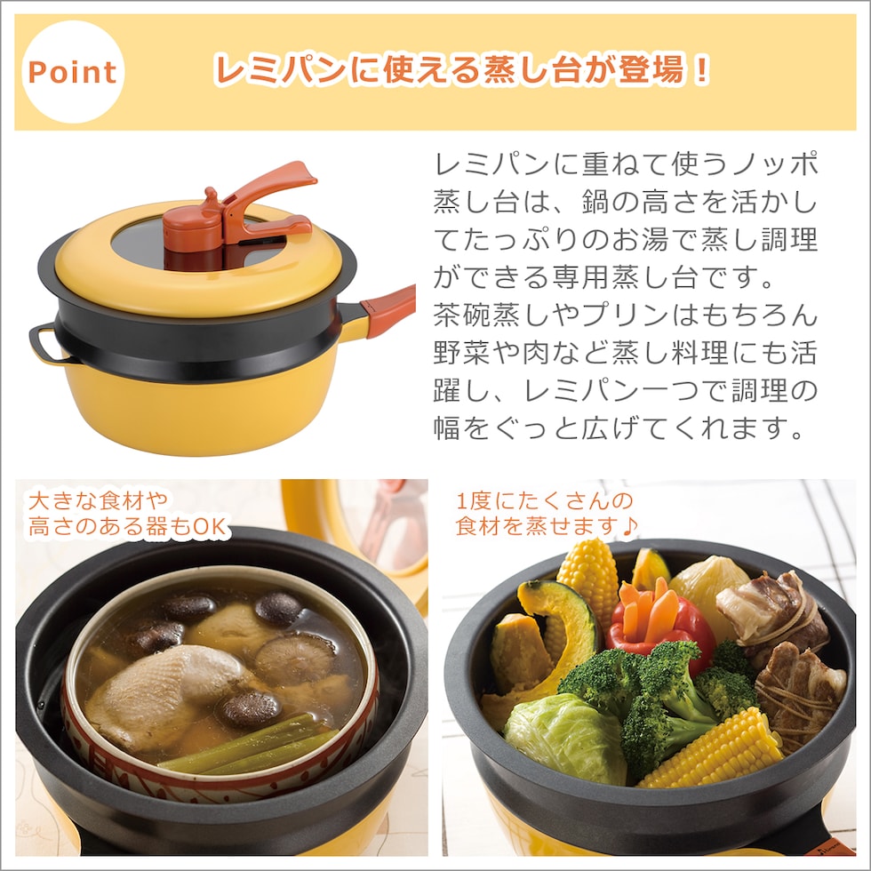 ・レミパンの上に重ねて使える蒸し台 ・深さがあるから大きな食材や高さのある器もOK ・たっぷりのお湯で、沢山の食材を一度に調理する時に活躍 |