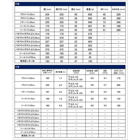 ・フライパン22cm / 26cm ・ソテーパン24cm ・ソースパン16cm / 20cm ・バタフライガラスぶた16cm / 20cm / 22cm / 24cm / 26cm ・シールリッド16cm / 20cm ・専用取っ手 2本 |