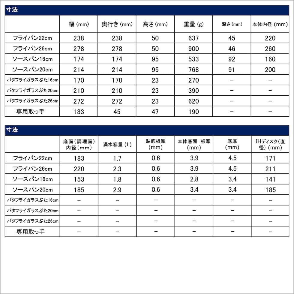 ・フライパン22cm ・フライパン26cm ・ソースパン16cm ・ソースパン20cm ・バタフライガラスぶた16cm ・バタフライガラスぶた20cm ・バタフライガラスぶた26cm ・専用取っ手 |