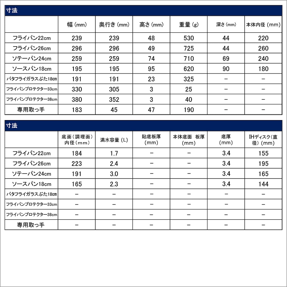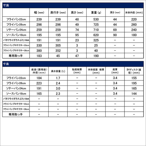 ・フライパン22cm ・フライパン26cm ・ソテーパン24cm ・ソースパン18cm ・ガラスぶた18cm ・フライパンプロテクター33cm×1枚 ・フライパンプロテクター38cm×2枚 ・専用取っ手×2本 |