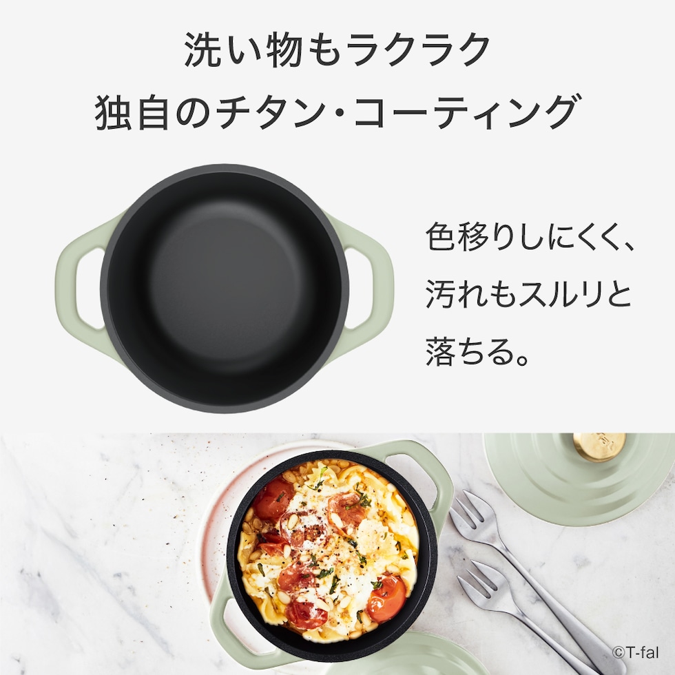 | 本体:アルミニウム合金 /(内面)チタン・コーティング、(外面)ふっ素樹脂塗膜加工 底:ラッカー塗装 取っ手、フタ、フタつまみ:アルミニウム合金 |