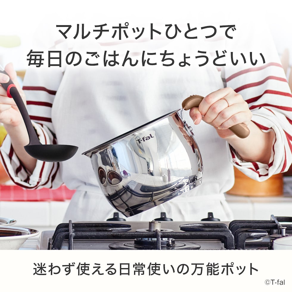・一台で何役もこなす、ころんとした形もかわいい、便利なマルチポット ・茹でる、炒める、煮る、焼く、ごはんを炊く、揚げる、お湯を沸かす、和えるなどのあらゆる調理場面で活躍 ・朝食や夜食など、少人数分の調理をマルチにサポート ・コンロの上に置いたままでも邪魔にならない形状 ・ガス(直火)、電気、電熱器、電磁調理器(IH100〜200V対応)、冷蔵庫、で使用可能 ・食洗機使用可能(ふたは不可) ・お知らせマークでベストなタイミングで調理スタート ・素早く均一な熱伝導でお料理がもっと美味しく仕上がる ・こびりつきにくさが続くコーティング ・耐久性に優れたステンレス製 |