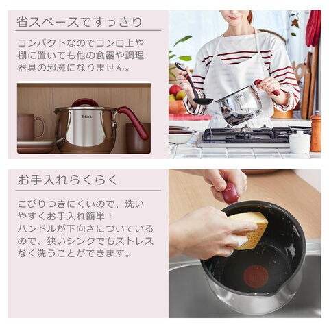 ●マルチポット 16cm ・一台で何役もこなす、ころんとした形もかわいい、便利なマルチポット ・茹でる、炒める、煮る、焼く、ごはんを炊く、揚げる、お湯を沸かす、和えるなどのあらゆる調理場面で活躍 ・朝食や夜食など、少人数分の調理をマルチにサポート ・コンロの上に置いたままでも邪魔にならない形状 ・ガス(直火)、電気、電熱器、電磁調理器(IH100~200V対応)、冷蔵庫、食洗機で使用可能 ・お知らせマークでベストなタイミングで調理スタート ・素早く均一な熱伝導でお料理がもっと美味しく仕上がる ・こびりつきにくさが続くコーティング ・耐久性に優れたステンレス製 ●フライパン 20cm/26cm ・スタッキングできるステンレスシリーズ ・デザインが変更した新しい「お知らせマーク」 ・握りやすいソフトタッチのハンドル ・取扱説明書付き ●キッチンシザーズ ・野菜や薬味などの下ごしらえに便利なキッチンバサミ ・握りやすく滑りにくいグリップ ・持続力が増した鋭い切れ味 ・分解できて隅々まで洗浄しやすく清潔をキープ ・利き手を選ばない両利き用 ・鋼を高温処理後に急冷することで硬度がアップ、耐久性が強化され錆びにくくなりました ●レードル ・鍋やフライパンを傷つけにくいナイロン樹脂製キッチンツール ・フィンガーレストが付いた持ちやすいデザイン |