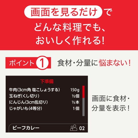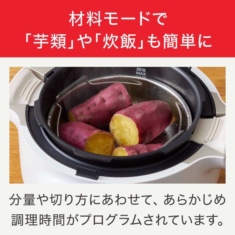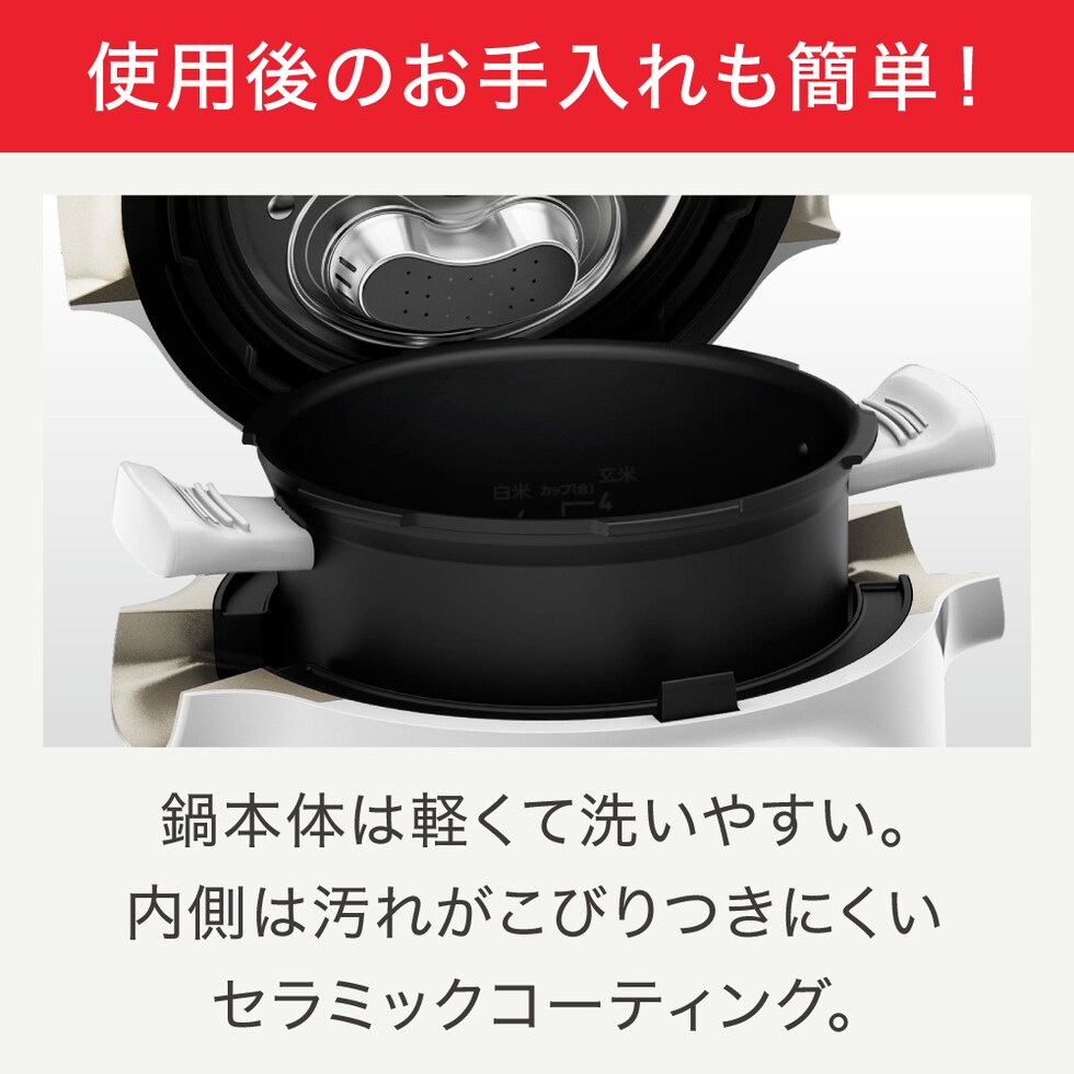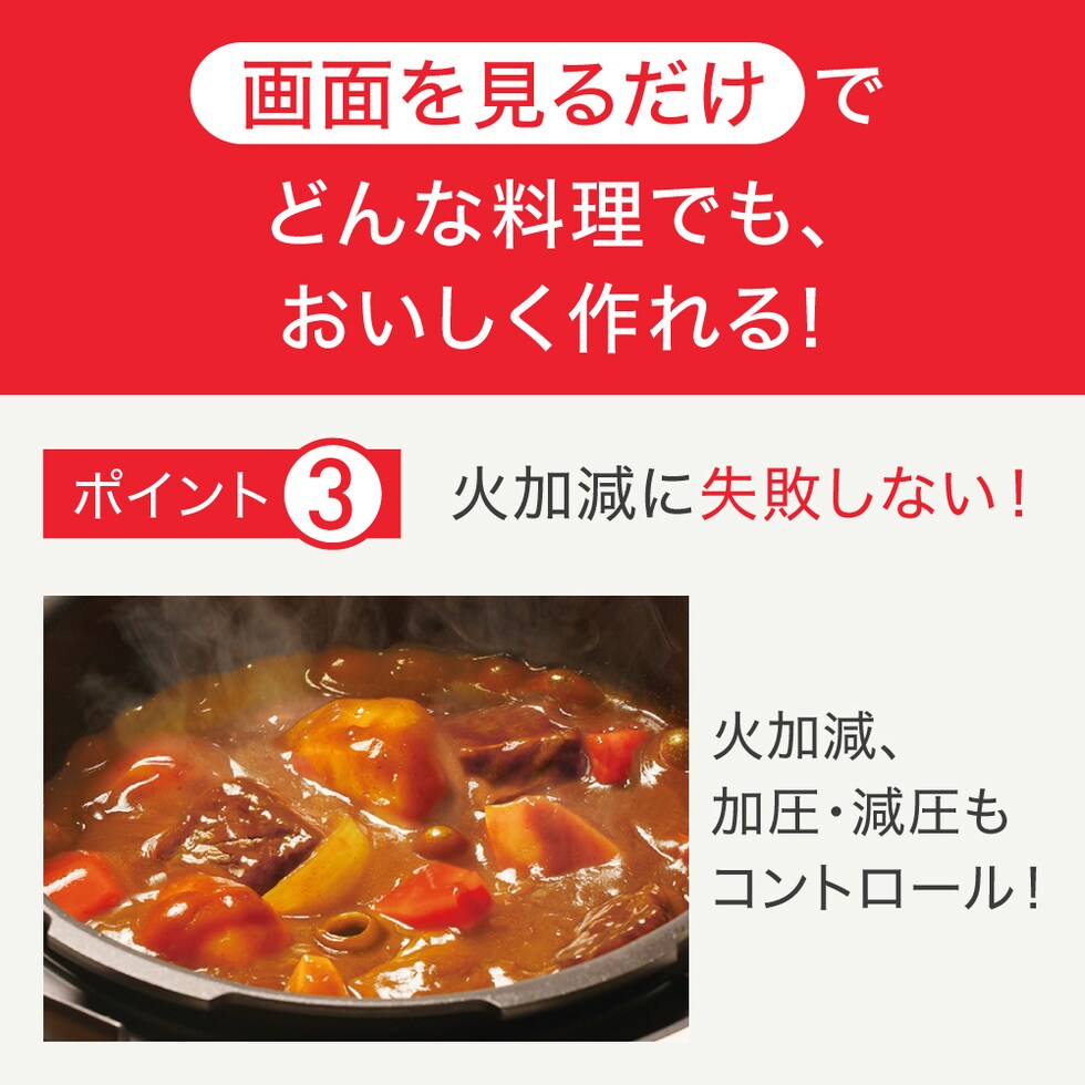 ・加圧調理/炒める/煮込む/蒸す/炊飯/保温/再加熱が可能 ・保温機能 ・液晶ナビゲーション ・予約調理(最大15時間の予約調理が可能) ・250レシピプログラム搭載(無水調理レシピが40種類) ・2~4人分の内蔵レシピ。炊飯は4合まで可能 ・予熱時間が短いハイパワー ・お手入れ簡単なセラミック加工なべ(本体から取り外し可能) ・自動排気で安心安全 ・保証書付き(保証:1年[消耗品、部品交換等は除く]) ※当店では省資源化の観点から納品書を荷物へ添付しておりません。発送完了通知メールに納品明細を記載しており、当明細を納品書の代わりとしてプリントアウトし保管ください。 |