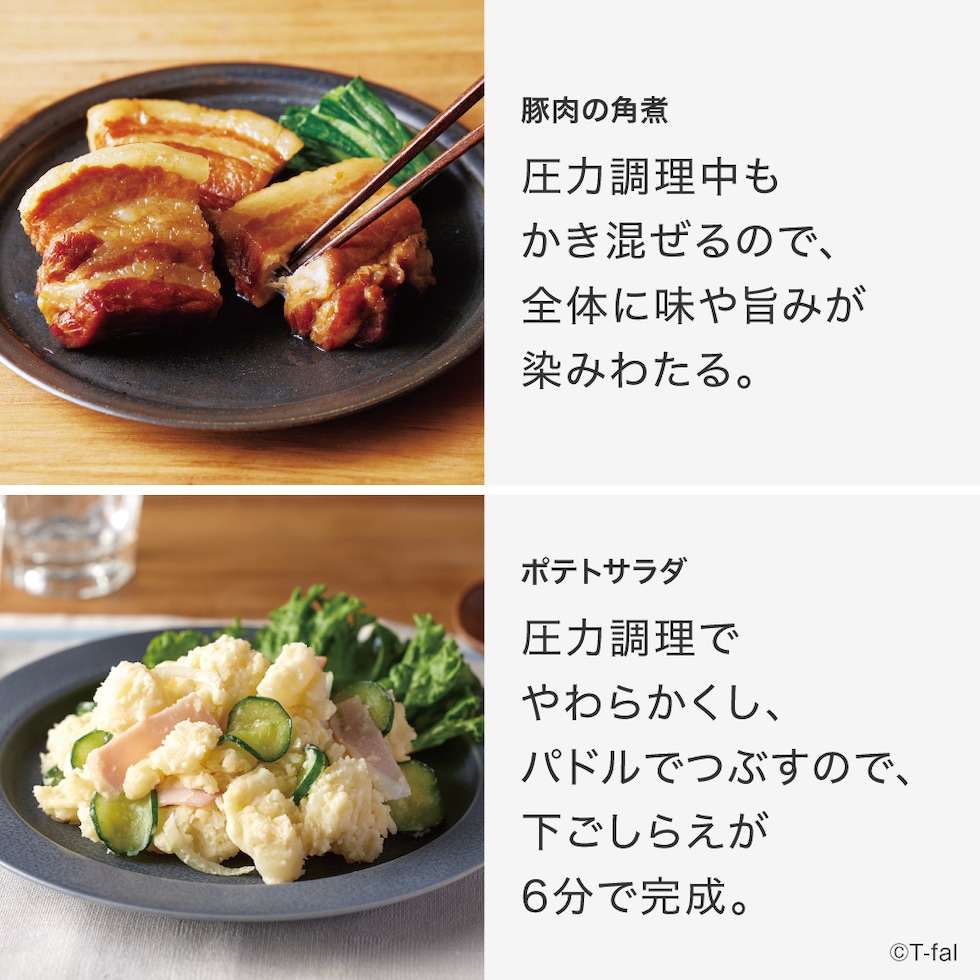・圧力調理中もかき混ぜることができ、煮込み料理はさらにおいしく、ポテトサラダは加熱からつぶすまで自動調理が可能