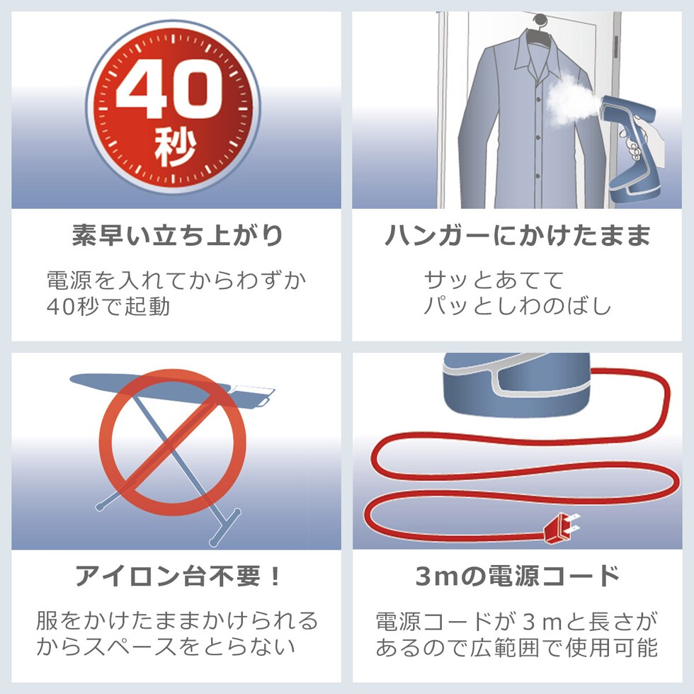・大量のパワフル連続スチームが繊維の奥まで浸透し、シワの原因となる絡みついた状態の繊維をしっかりほぐすしてシワをきれいにのばせます