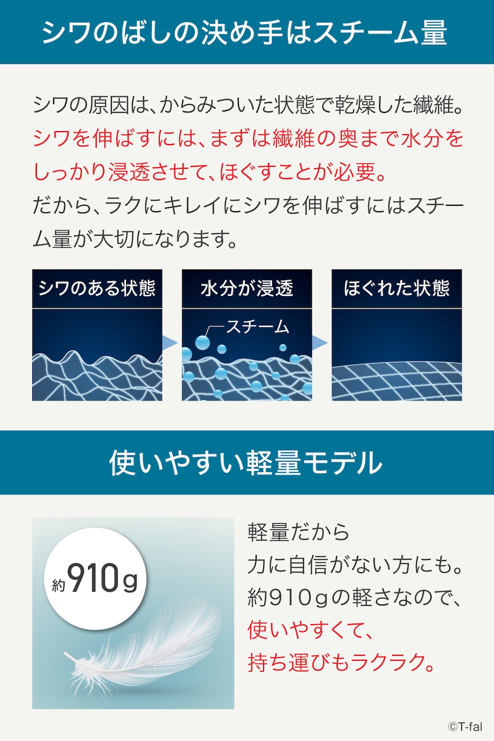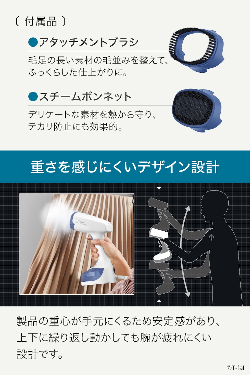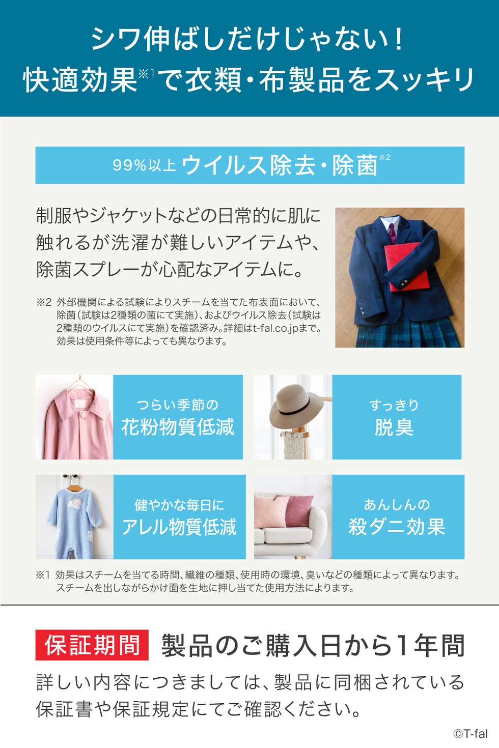 ・ハンガーなどに掛けたまま、さっと衣類のシワ伸ばしが可能 ・パワフルスチーム&軽量コンパクト ・長時間の使用でも疲れにくいトリガーロック機能 ・平均21g分のパワフル連続スチーム ・忙しい朝やお出かけ前にサッとケアができる、約15秒の素早い立ち上がり ・除菌、脱臭、花粉、アレル物質の低減、殺ダニ効果など、日常的に気になる部分に嬉しい効果 |