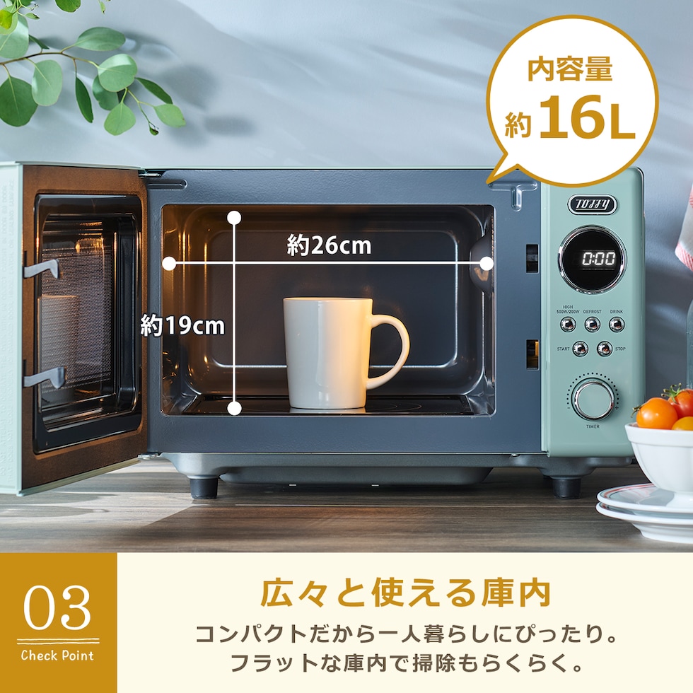 ・フラットな庫内で広々使えて掃除もしやすい、レトロスタイルの電子レンジ ・ボタンが少なくカンタン操作 ・ひとり暮らしにもぴったりな16Lサイズ ・あたためから本格的な煮込み料理や蒸し料理まで |