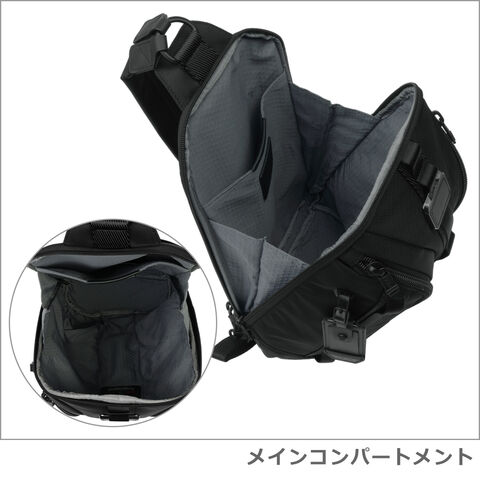 ・メインコンパートメント(ダブルファスナー開閉 / オープンポケット × 1) ・正面右サイドポケット(ファスナー開閉 / キーストラップ × 1、カードポケット × 2、ペンホルダー × 2) ・正面左サイドポケット(ファスナー開閉 / 防水加工(排水穴付)) ・デイジーチェーンループ(フロント・サイド) ・中央で分離してショルダーハーネスにもなるマグネット式ショルダーストラップ ・背面にオープンポケット × 1 ・トレイサータグ |