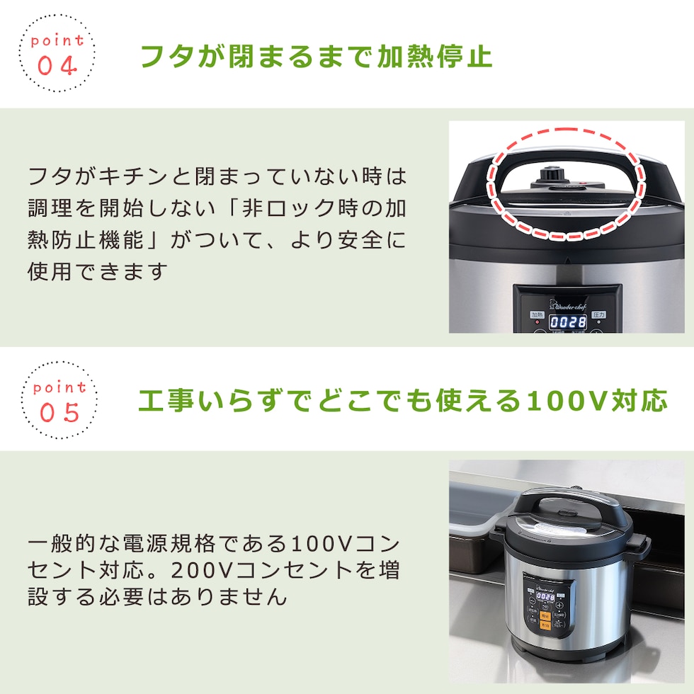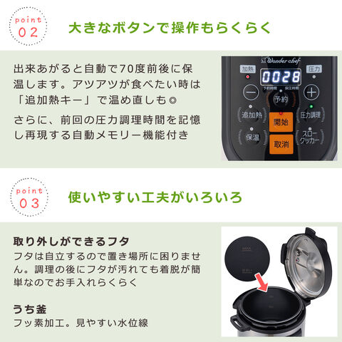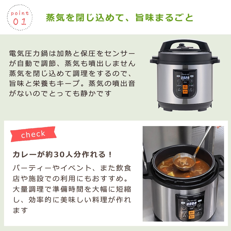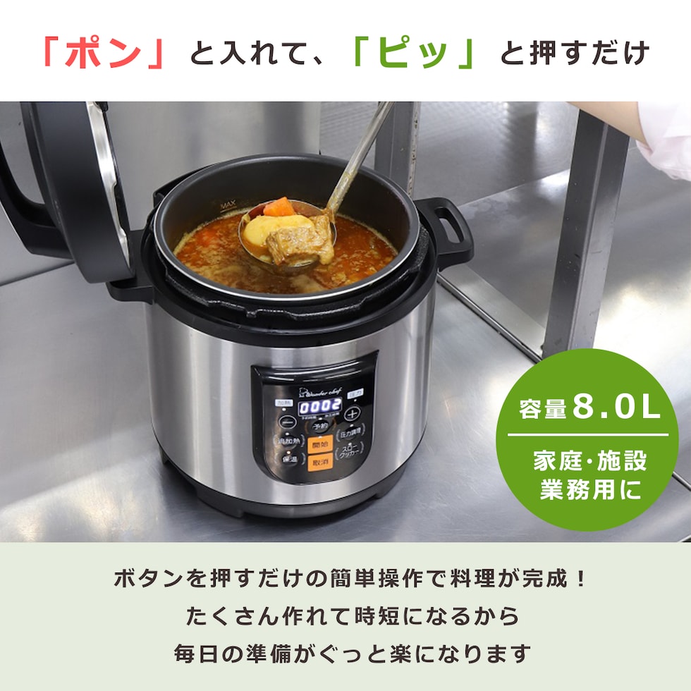 ・一度に多くの食材を調理できる、プロ仕様の電気圧力鍋(6~8人向け) ・家庭用から業務・施設用にも対応できる大容量の8.0Lサイズ ・大きなパネルでボタンを押すだけのわかりやすい直感的操作 ・蒸気を閉じ込めて調理をするから、旨味と栄養をキープ ・調理後は自動で70度前後に保温。温め直しも可能 ・「非ロック時の加熱防止機能」付だから安心安全 ・前回の圧力調理時間を記憶し再現する「自動メモリー機能」搭載 |