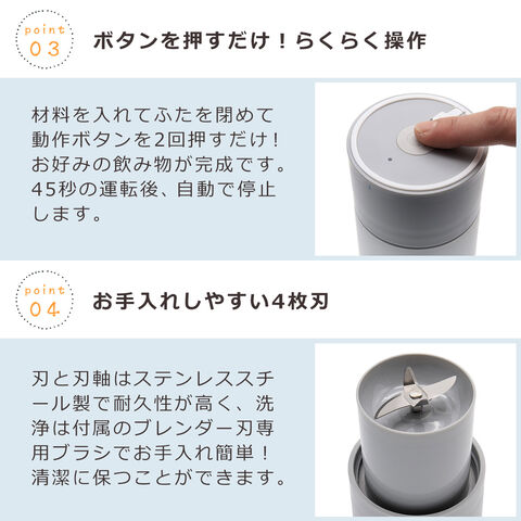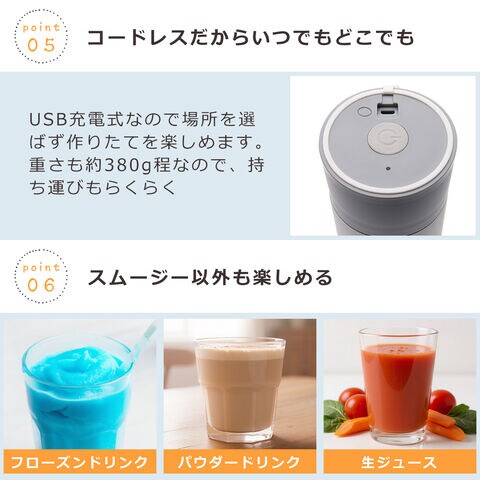 ・真空二重容器の保冷が出来るステンレスブレンダー ・さっと手軽にたったの45秒でオリジナルのスムージー作り ・真空断熱構造により、作った飲み物の冷たさを長時間キープ ・ボトルのふたを替えれば、水筒としてそのまま持ち運べる2way仕様 ・ふたを付け替えると約220gになり、さらに軽量コンパクト ・USB充電式でコードレスだから持ち運んでどこでも利用可能 |