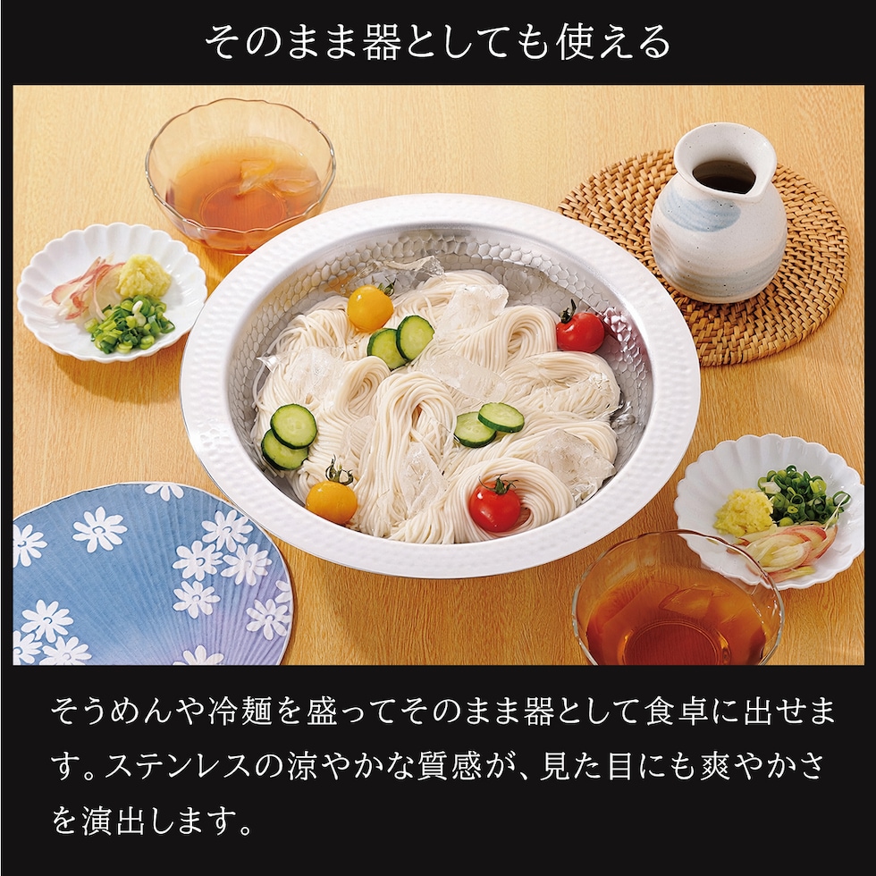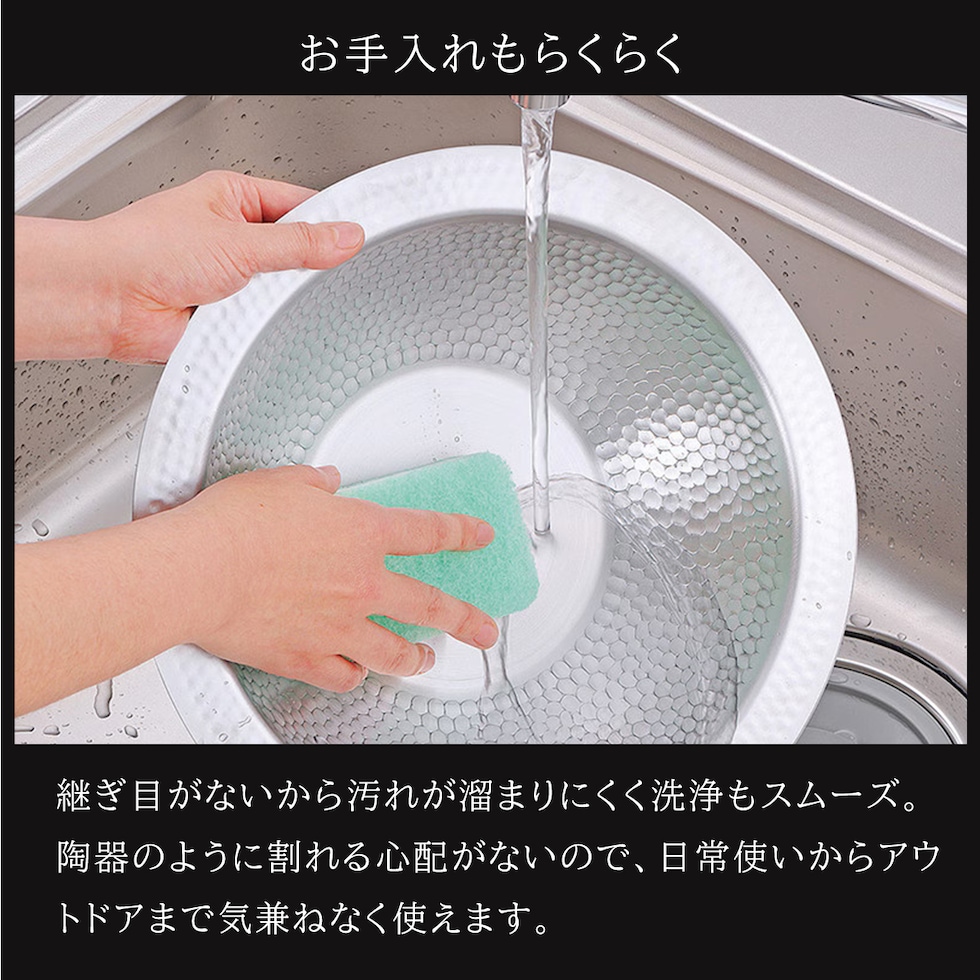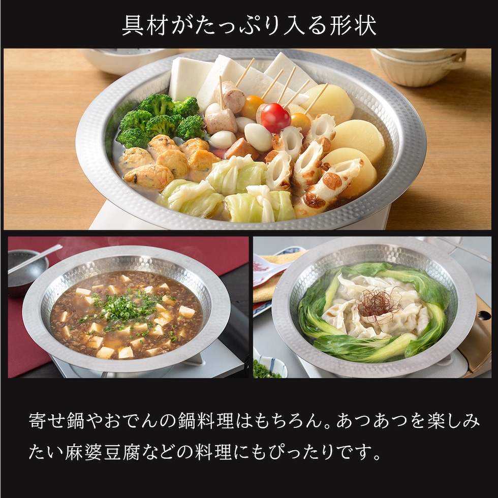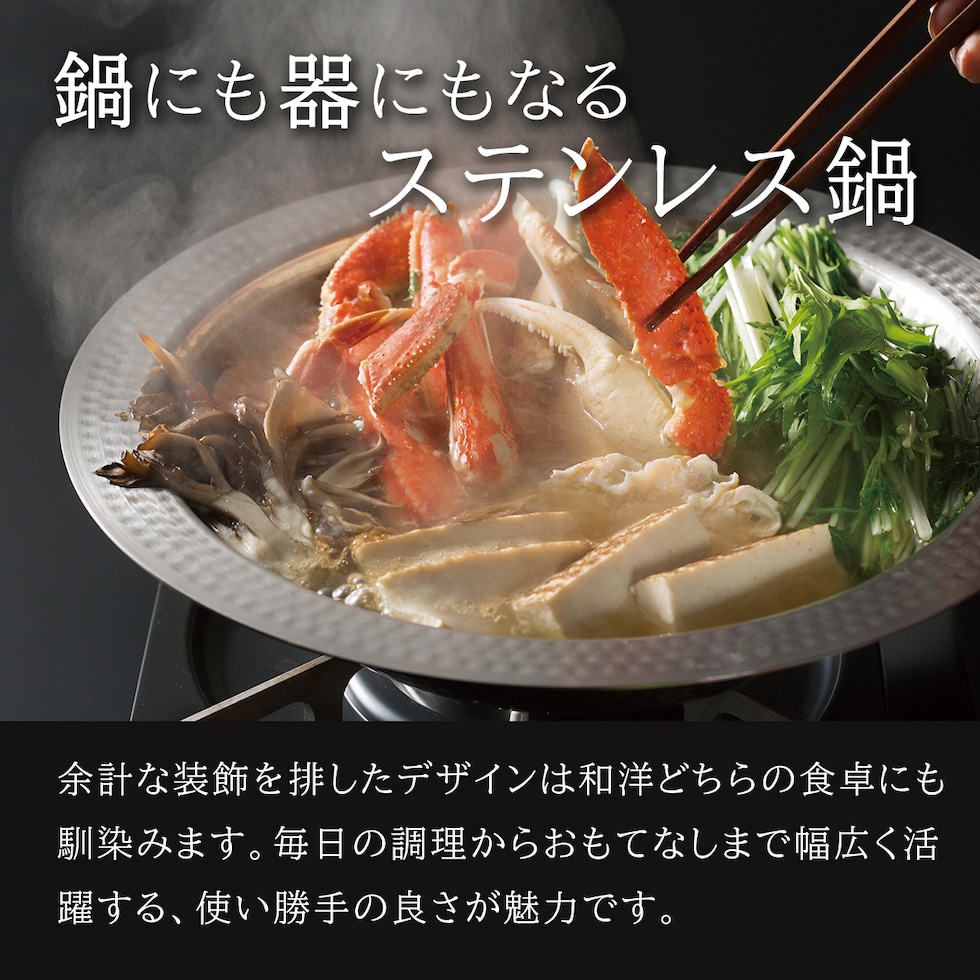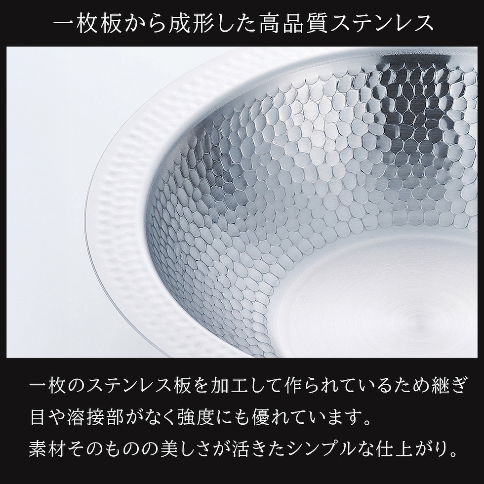 ・一枚板を加工して作った、つなぎ目が無く美しいよせしゃぶ鍋 ・燕三条製にこだわったステンレス製品 ・味わい深い凸凹とした槌目模様が特徴的 ・つなぎ目が無いため洗いやすく、扱いやすさは抜群 ・お鍋として、器として、使い勝手の良いシンプルデザイン ・直火にも、IHにも対応 |