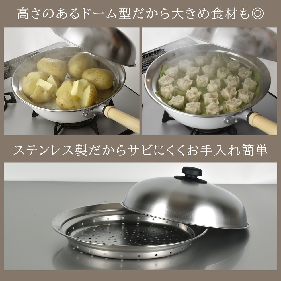 ・お手持ちのフライパンに乗せるだけで簡単に蒸し料理が楽しめる蒸し台 ・フライパンサイズは24〜26cmに対応 ・たっぷり調理できる高さのあるドーム型の蓋 ・サビに強く、お手入れが楽なステンレス製 |
