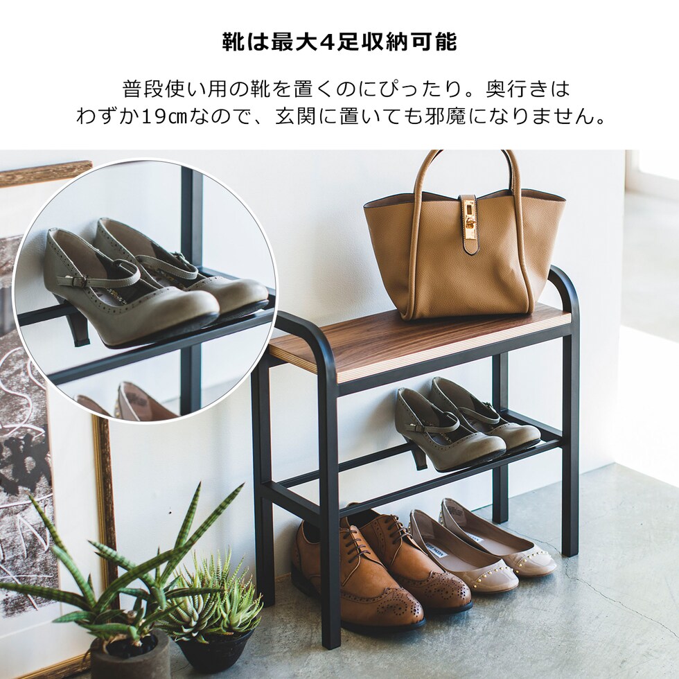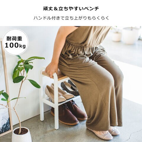 ・お出かけ前やご帰宅時の靴の着脱、荷物置きに便利なベンチシューズラック ・ハンドル付きだから立ち上がりやすい ・木の座面が上品なシンプルデザイン ・座面の下には大人の靴を最大4足収納可能 ・ハイヒールも後方のバーにひっかけて収納可能 |