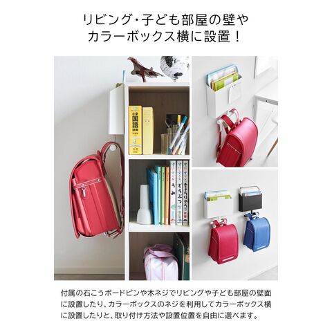 ウォールファイルボックス&ランドセルハンガー タワー 石こうボード壁対応 壁面やカラーボックス横に ランドセルや学習用品を一括収納!忘れ物対策にも◎ ランドセルや宿題、連絡帳やプリントなど、毎日の通学に必要な学習用品を一か所にまとめて収納できる、壁面設置のランドセルハンガー&ファイルボックスです。付属の石こうボードピンや木ネジでお好みの場所に自由に設置でき、置く場所がバラバラになりがちなランドセルや学習用品の定位置を作ることができます。カラーボックス横にも取り付け可能です。 収納する場所をきちんと決めてあげると、お片付けの習慣が自然と身に付き忘れ物の防止にもつながります。 ファイルボックスはA4のクリアファイルが横向きで入る大きさ。スチール製なので、外側はお手持ちのマグネットを貼るマグネットボードにもなります。時間割や献立表などを貼り付ければスケジュール管理も簡単に。 リュックやタブレット、雑誌などの収納にも便利にお使いいただけます。 イメージとして複数個を使用した写真を掲載しておりますが、こちらは「ウォールファイルボックス&ランドセルハンガー タワー 石こうボード壁対応」単品でのお届けとなります。 ![]() ![]() ![]() ![]() ![]() ![]() ![]() ![]() ![]() ![]() ![]() ![]() ![]() ![]() ![]() ![]() |