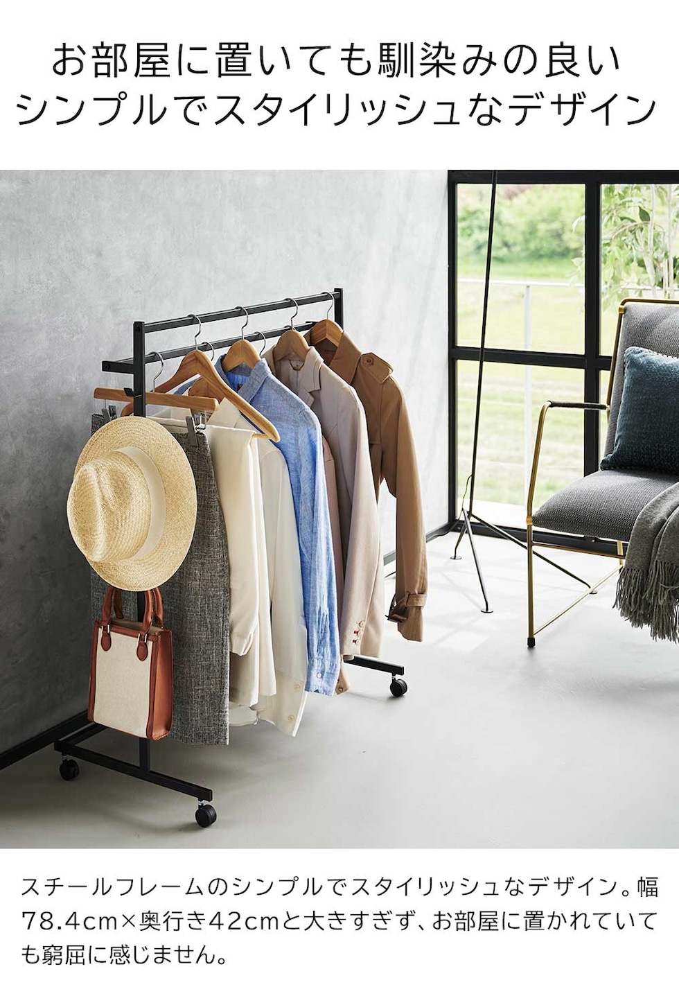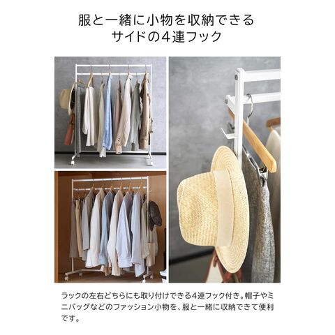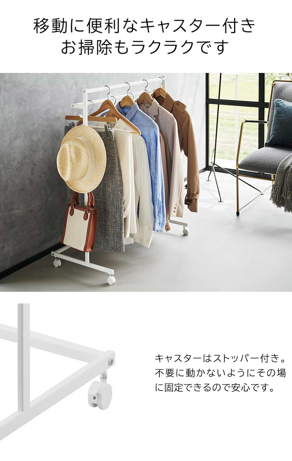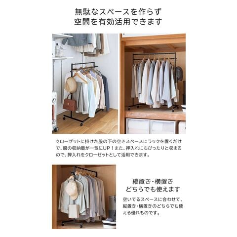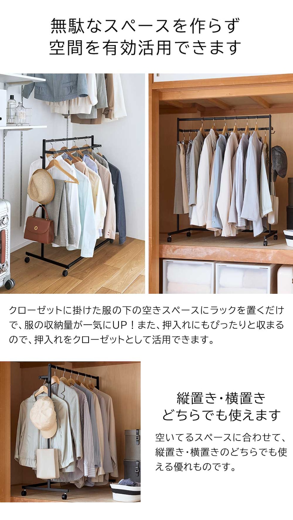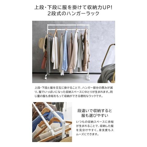 収納力アップハンガーラック タワー 2段 段違いに服を掛けて収納力アップ! ハンガーラック 2段 上段・下段に服を掛けるからハンガー部分の厚みが減り、収納力が上がる2段式のハンガーラックです。服でいっぱいの収納スペースに余裕ができるので、服選びがしやすくなり身支度もスムーズに。クローゼットに掛けた服の下にこちらのラックを置くだけで収納量が上がり、デッドスペースを収納スペースに変えてくれます。押入れにも収まるサイズなので、押入れを新たにクローゼットとして活用!お部屋の空間を無駄なく使える優れものです。また、縦・横どちらの向きでもスペースに合わせて設置可能。キャスター付きで移動や掃除もラクラクです。サイドの4連フックには、帽子やミニバッグなどのファッション小物を収納。ラックの左右どちらにも取り付け可能です。 |