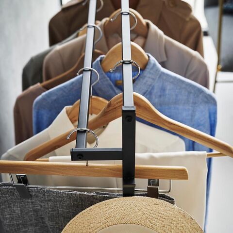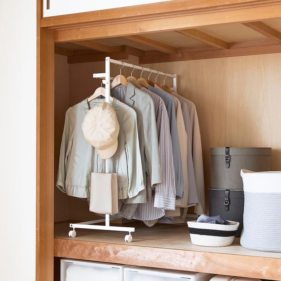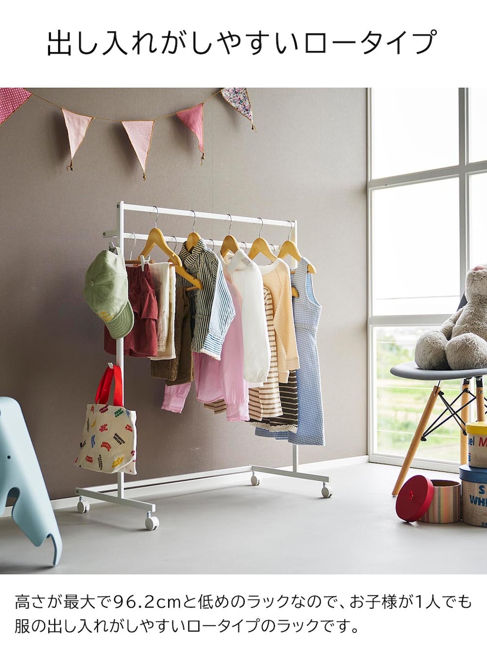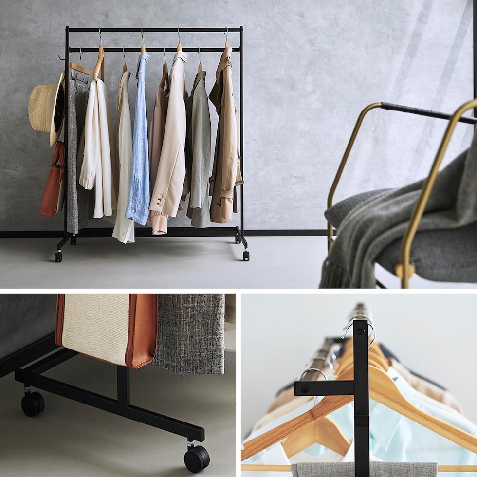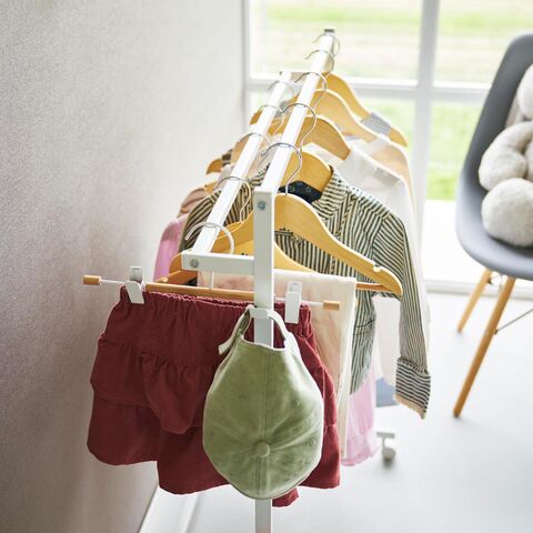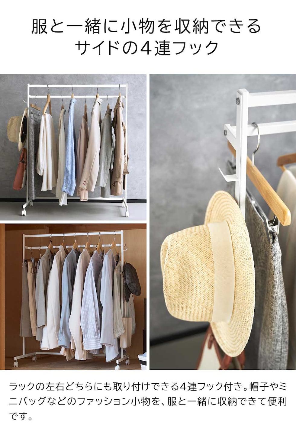 収納力アップハンガーラック タワー 2段 段違いに服を掛けて収納力アップ! ハンガーラック 2段 上段・下段に服を掛けるからハンガー部分の厚みが減り、収納力が上がる2段式のハンガーラックです。服でいっぱいの収納スペースに余裕ができるので、服選びがしやすくなり身支度もスムーズに。クローゼットに掛けた服の下にこちらのラックを置くだけで収納量が上がり、デッドスペースを収納スペースに変えてくれます。押入れにも収まるサイズなので、押入れを新たにクローゼットとして活用!お部屋の空間を無駄なく使える優れものです。また、縦・横どちらの向きでもスペースに合わせて設置可能。キャスター付きで移動や掃除もラクラクです。サイドの4連フックには、帽子やミニバッグなどのファッション小物を収納。ラックの左右どちらにも取り付け可能です。 |