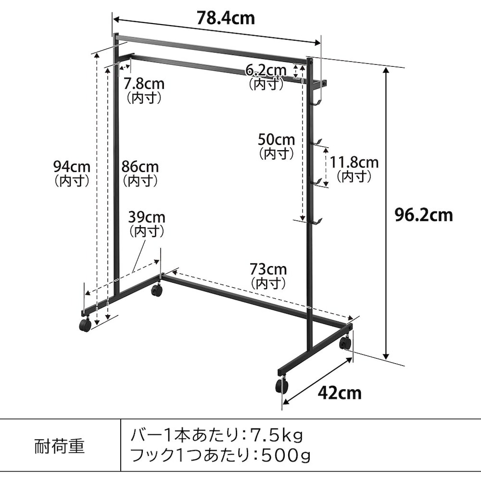 耐荷重 バー1本あたり:7.5kg フック1つあたり:500g(静止荷重) |