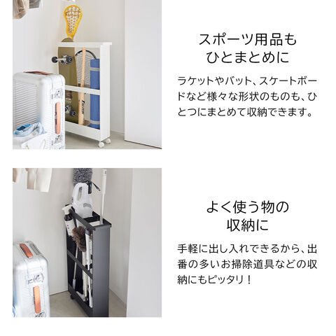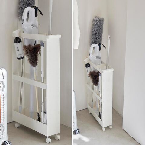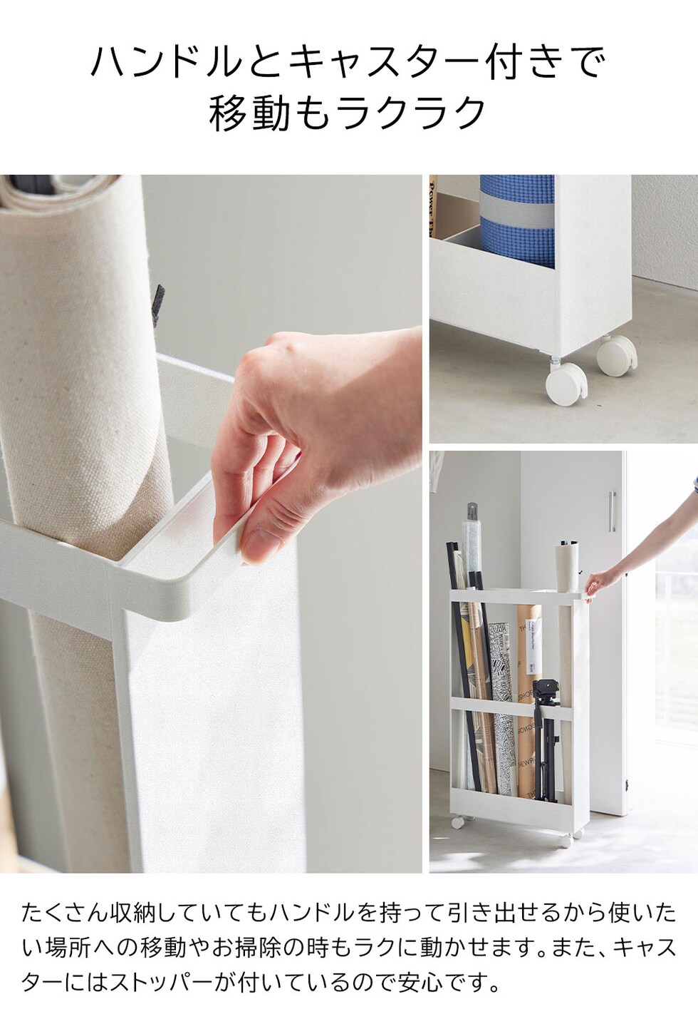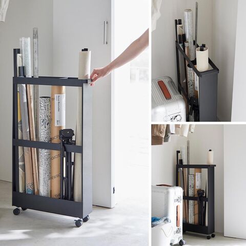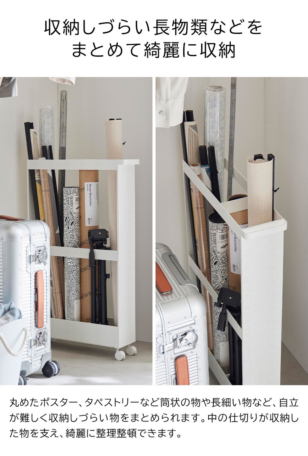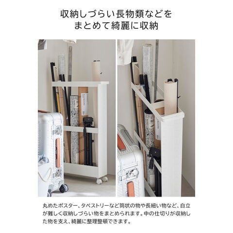キャスター付き長物収納スリムワゴン タワー 収納しづらい長物をまとめてスリムに収納できる キャスター付きワゴン 丸めたポスターやタペストリーなどの筒状の物、ラケットやバットなどの長さのある物といった、様々な長物を綺麗にまとめられる収納ワゴンです。 幅13cmのスリムな形状だからクローゼット内の隙間を活用して収納できます。 ハンドルとキャスターが付いているので出し入れもラクラク。よく使うお掃除道具を入れても便利に使えます。 付属のスパナでキャスターを取り付けるだけの簡単組み立てで、購入後すぐに使用できます。 |