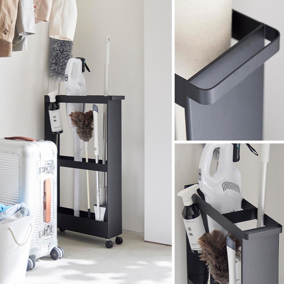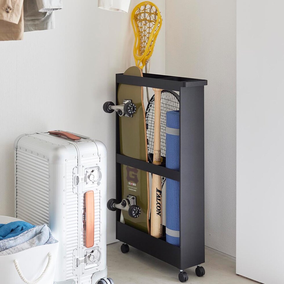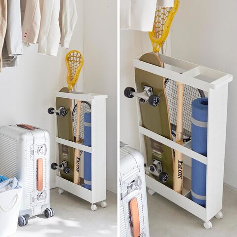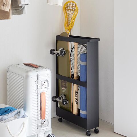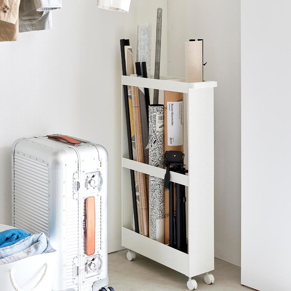 キャスター付き長物収納スリムワゴン タワー 収納しづらい長物をまとめてスリムに収納できる キャスター付きワゴン 丸めたポスターやタペストリーなどの筒状の物、ラケットやバットなどの長さのある物といった、様々な長物を綺麗にまとめられる収納ワゴンです。 幅13cmのスリムな形状だからクローゼット内の隙間を活用して収納できます。 ハンドルとキャスターが付いているので出し入れもラクラク。よく使うお掃除道具を入れても便利に使えます。 付属のスパナでキャスターを取り付けるだけの簡単組み立てで、購入後すぐに使用できます。 |