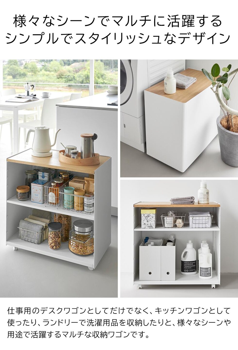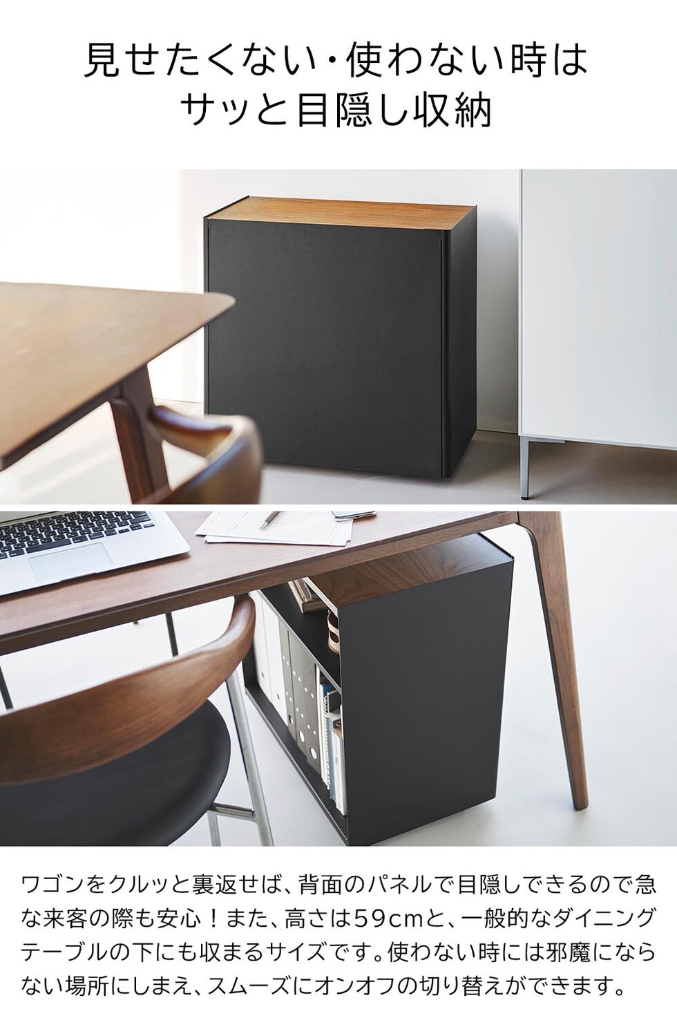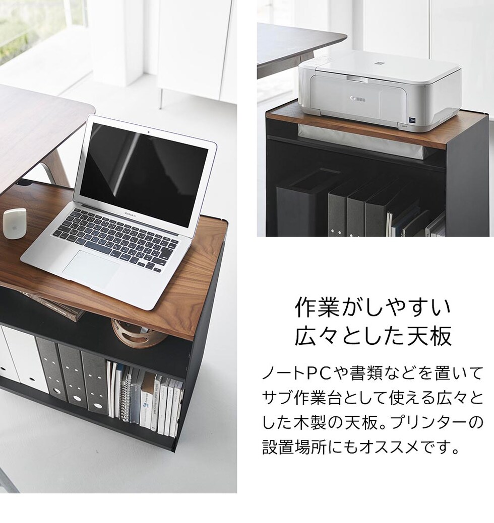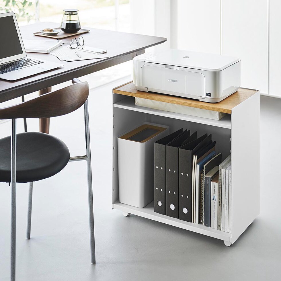 リビングやダイニングと仕事スペースを兼用する在宅勤務は、ついついお部屋が散らかりがちに。こちらのワゴンは仕事道具をひとまとめに収納できるので、面倒な仕事の準備や片付けもあっという間にできます。ワゴン最上段は、ノートPCや書類を広げて作業できる広々とした木製の天板。プリンターの設置場所にもオススメです。ワゴン内の棚板は、収納する物に合わせて6段階で調整可能。電源コードを通せるように、天板の片隅と棚板や底板の奥側に空間があり、配線もスッキリと整います。また本体はスチール製なので、マグネット付き電源タップを取り付けて使うのも便利です。 キャスター付きで移動もスムーズ。仕事をしたい場所へ、仕事道具を一度に運べるので便利です。仕事が終わったらサッとテーブル下にしまえるので、オンオフの切り替えもスムーズです。急な来客時など、収納した物を見せたくない時はクルッと裏返して目隠し収納もできます。 シンプルでスタイリッシュなデザインなので、キッチン収納や洗濯用品の収納にと、様々な場所やシーンで活躍できるマルチなワゴンです。