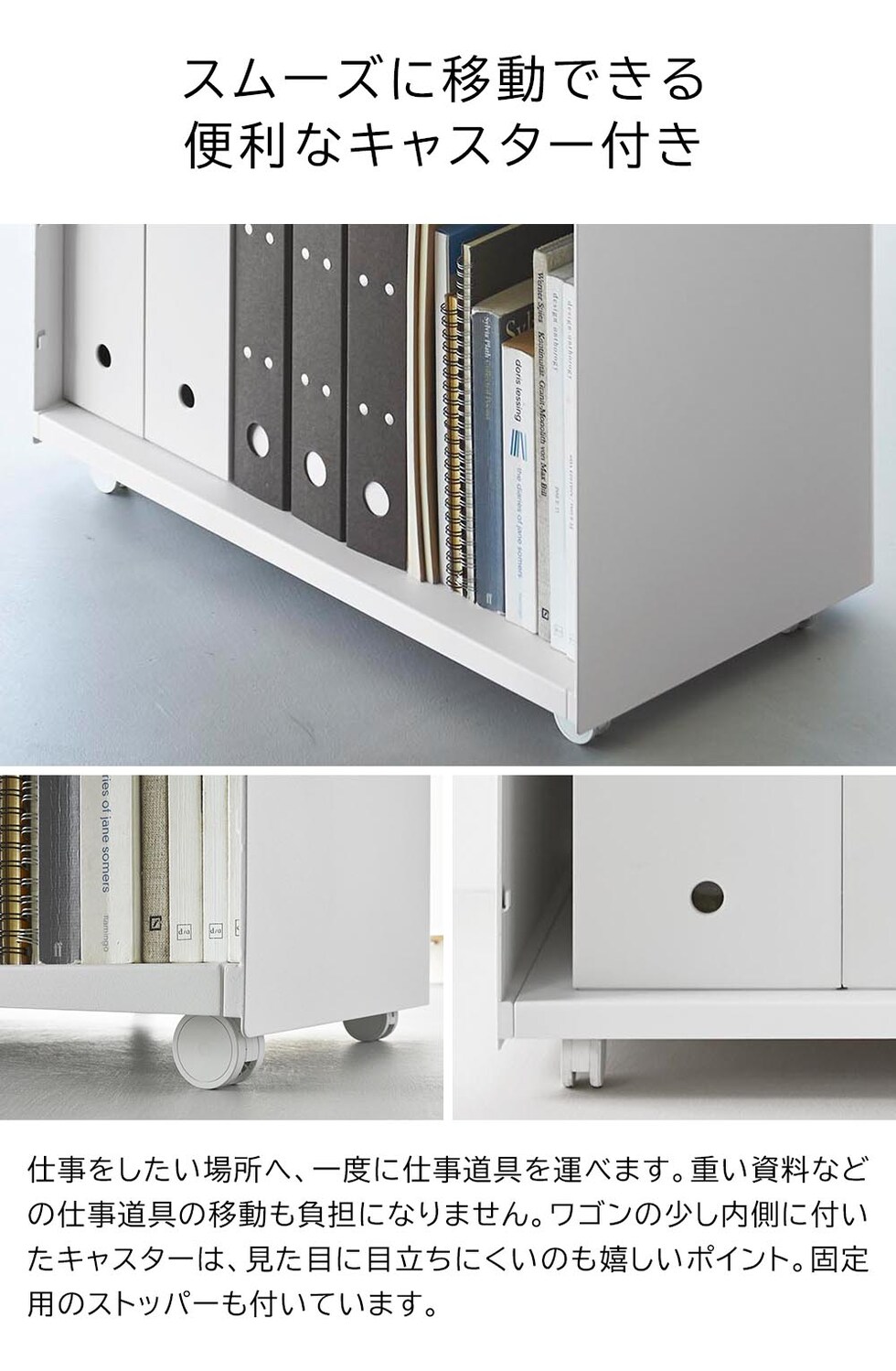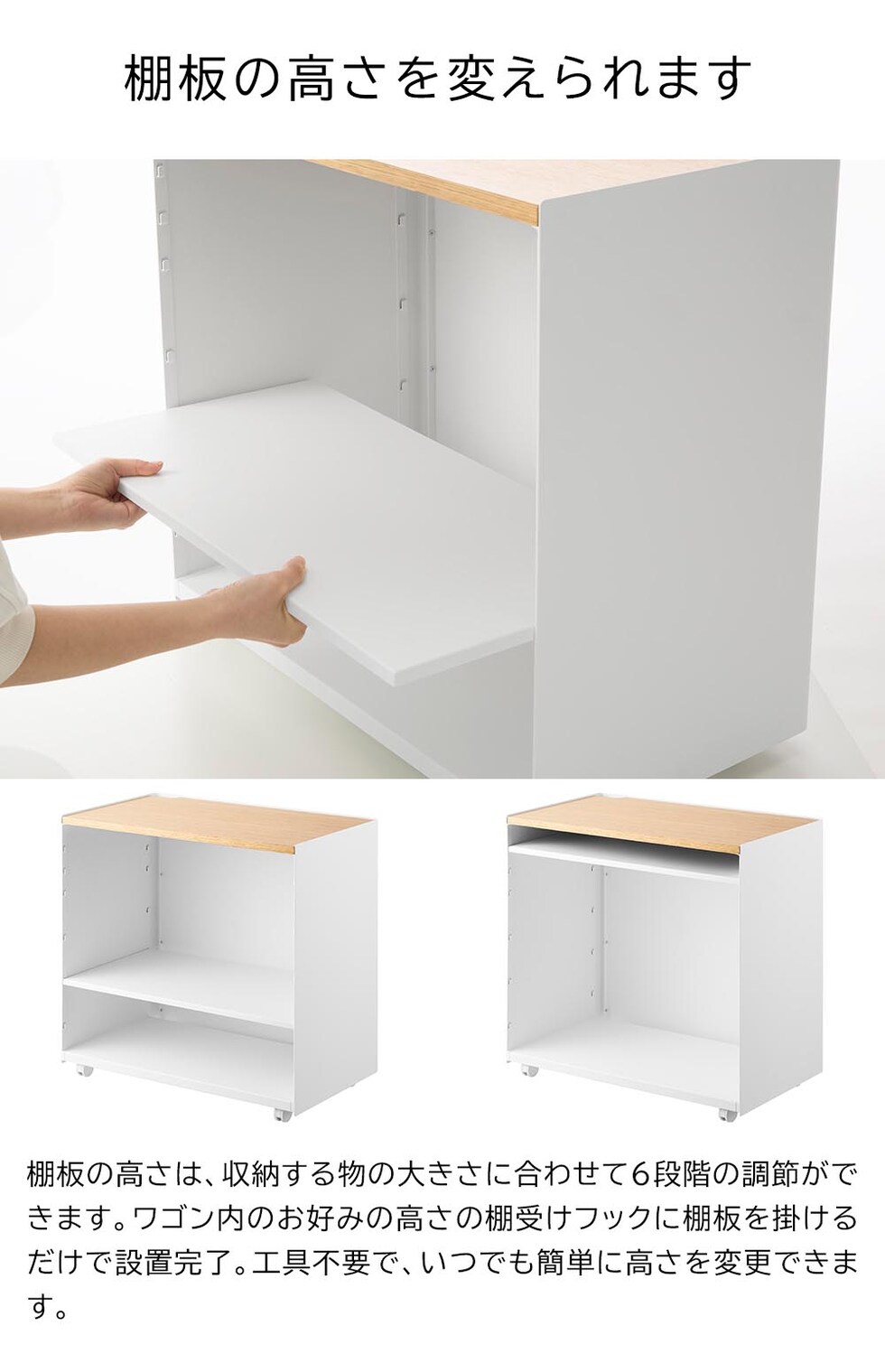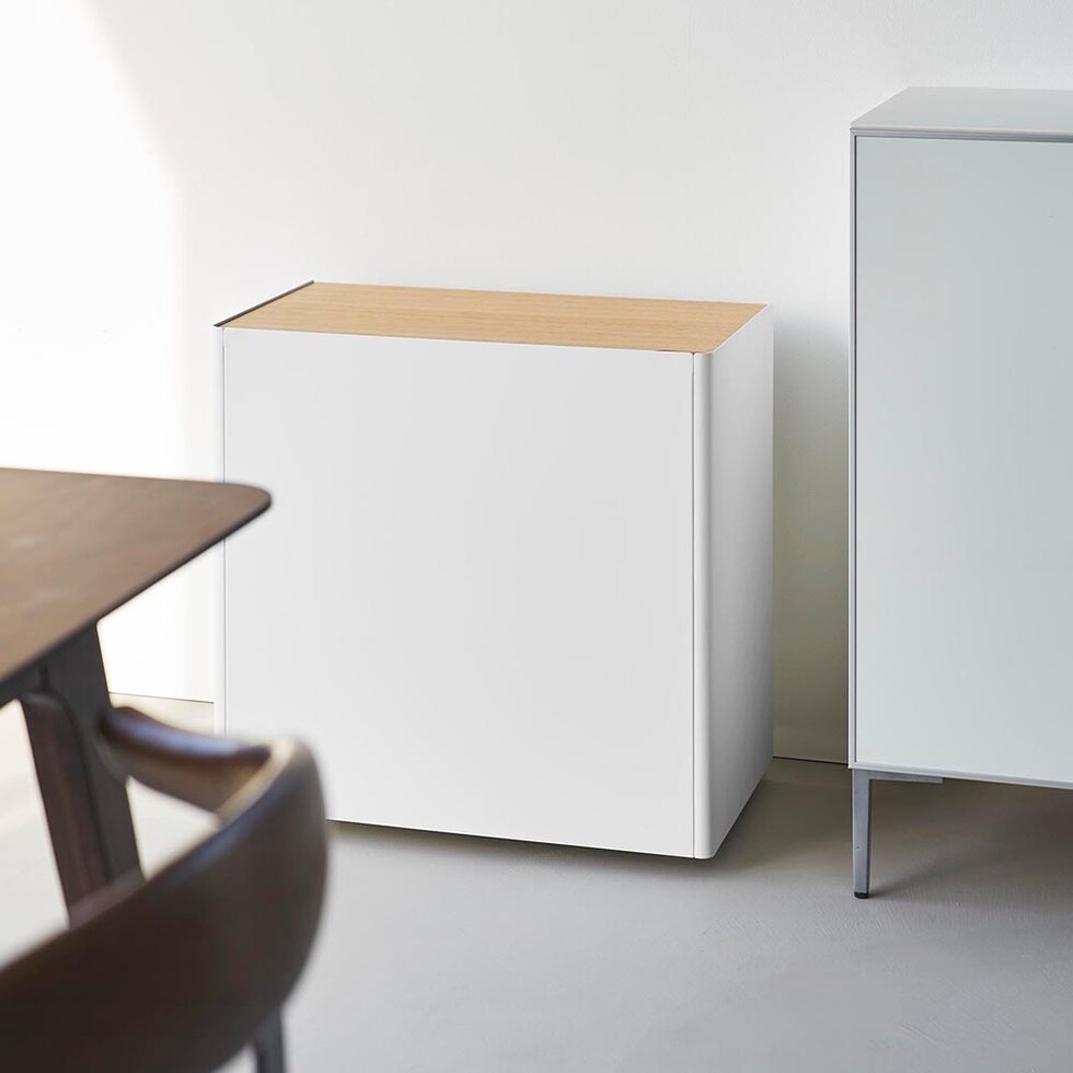 リビングやダイニングと仕事スペースを兼用する在宅勤務は、ついついお部屋が散らかりがちに。こちらのワゴンは仕事道具をひとまとめに収納できるので、面倒な仕事の準備や片付けもあっという間にできます。ワゴン最上段は、ノートPCや書類を広げて作業できる広々とした木製の天板。プリンターの設置場所にもオススメです。ワゴン内の棚板は、収納する物に合わせて6段階で調整可能。電源コードを通せるように、天板の片隅と棚板や底板の奥側に空間があり、配線もスッキリと整います。また本体はスチール製なので、マグネット付き電源タップを取り付けて使うのも便利です。 キャスター付きで移動もスムーズ。仕事をしたい場所へ、仕事道具を一度に運べるので便利です。仕事が終わったらサッとテーブル下にしまえるので、オンオフの切り替えもスムーズです。急な来客時など、収納した物を見せたくない時はクルッと裏返して目隠し収納もできます。 シンプルでスタイリッシュなデザインなので、キッチン収納や洗濯用品の収納にと、様々な場所やシーンで活躍できるマルチなワゴンです。