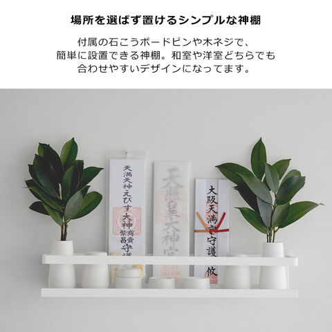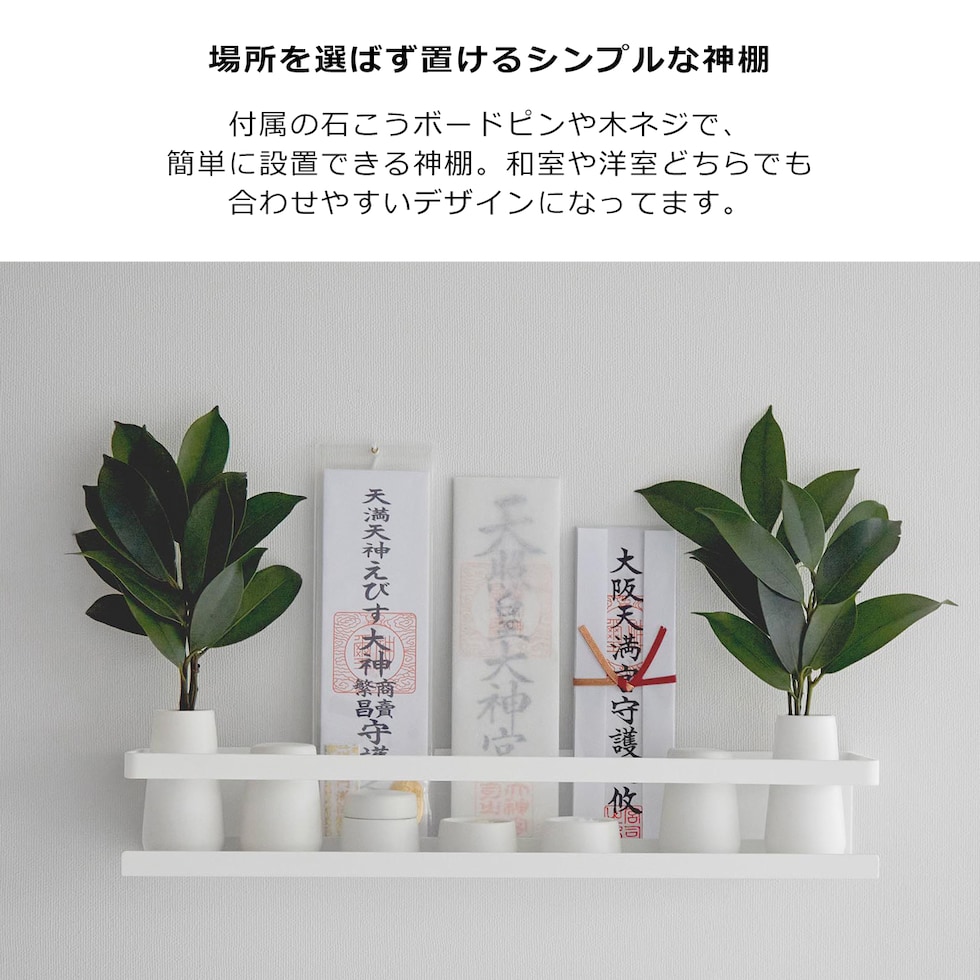 ・石こうボードピンで簡単取り付け出来る、スタイリッシュな神棚と神具セット ・お部屋のインテリアの邪魔をしないシンプルなデザイン ・壁面穴が目立ちにくい石こうボードピンで簡単取り付け可能 ・神札が立つ仕切り付き |