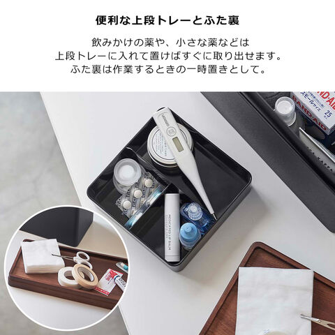 ・モダンでスタイリッシュな大容量の救急箱 ・段のトレーはスライド式で縦or横どちらの向きでも収納が可能 ・木の蓋を裏返せばトレーとして使用可能 ・持ち運びに便利な取っ手付き |