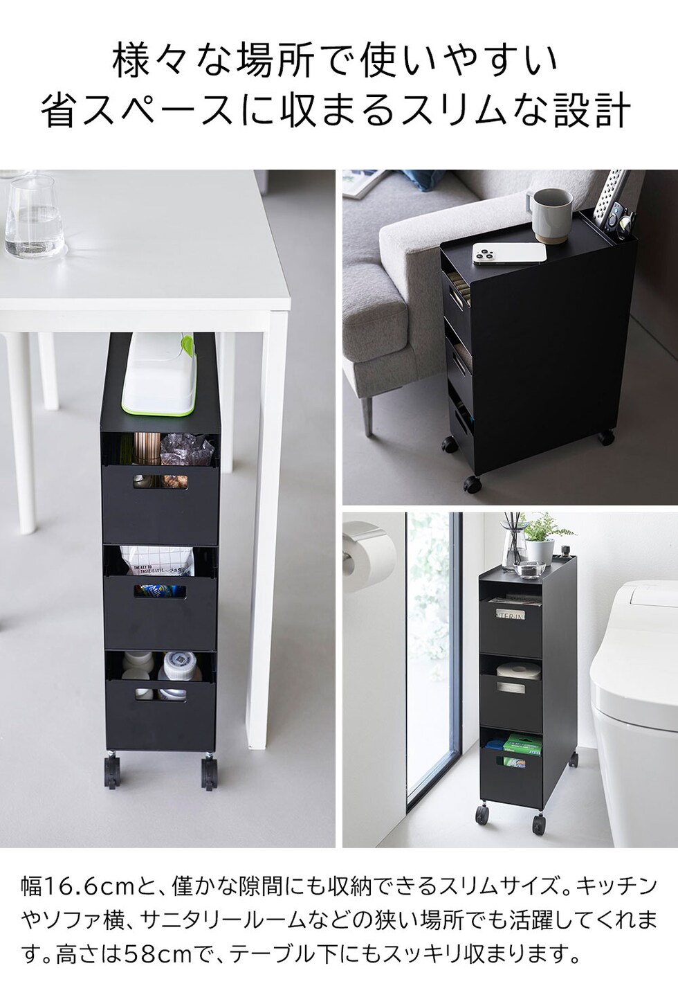 商品サイズ 本体:W16.6×D43×H58cm バスケット:W15.3×D32.1×H12.2cm(1つあたり) |