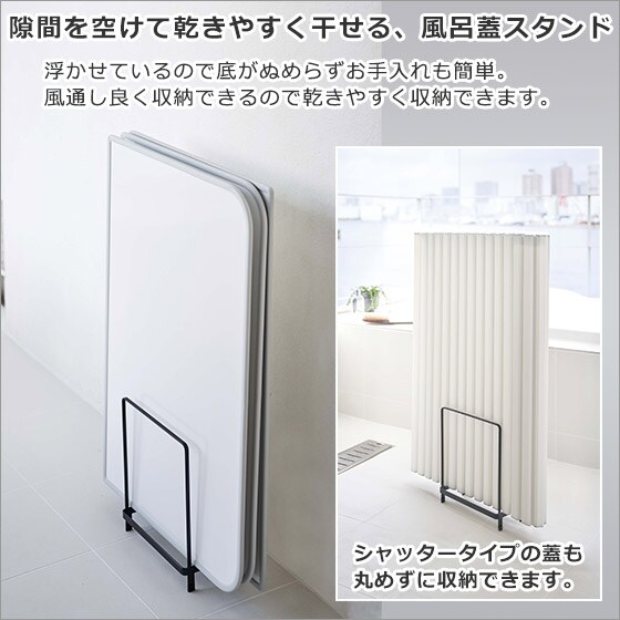 | 【通気性が良い風呂蓋スタンド!】 隙間を空けて乾きやすく干せる、風呂蓋スタンド!浮かせているので底がぬめらずお手入れも簡単です。風通し良く収納できるので乾きやすく収納できます。シャッタータイプの風呂蓋も丸めずに広げて収納できるので、カビやぬめりが発生しにくく快適です。 |