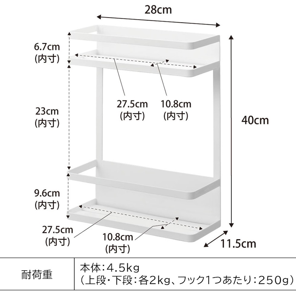 耐荷重 本体:4.5kg(上段・下段:各2kg フック1つあたり:250g) |