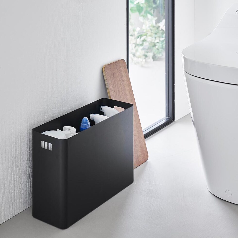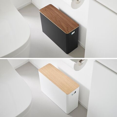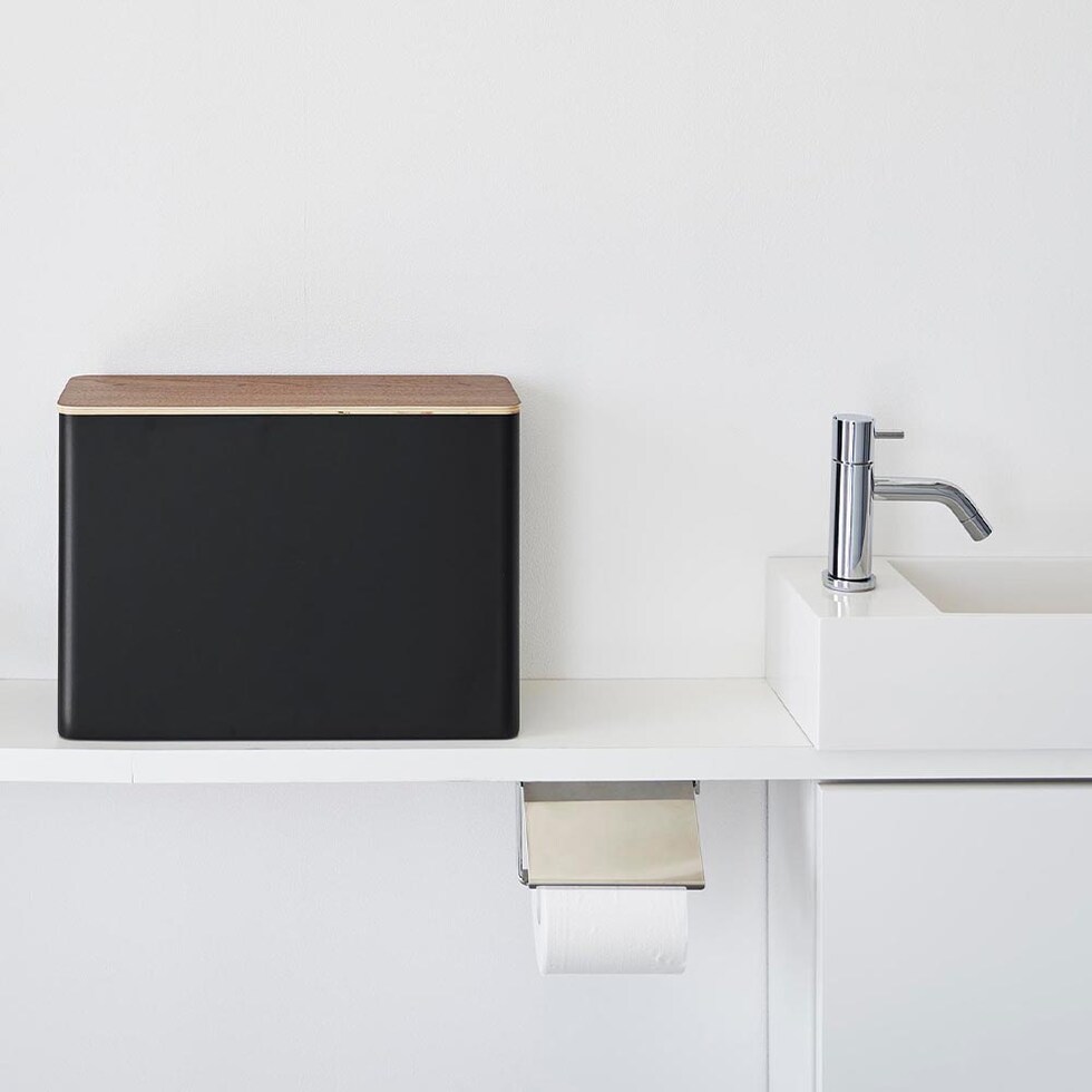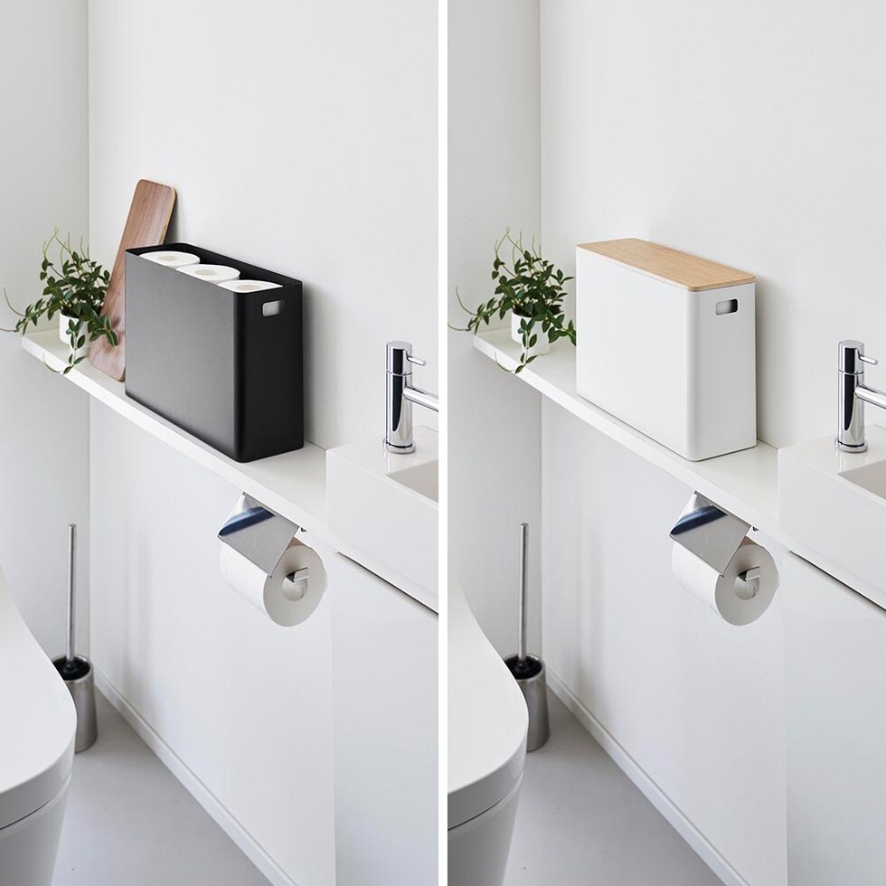 蓋付きトイレ用品収納 リン トイレの必需品を整理整頓 美しく隠しておける蓋付き収納ボックス トイレで必要なトイレットペーパーなどのストック類やお掃除用品をスッキリと収められる収納ボックスです。 蓋付きだから生活感を目隠しして片付けられます。 棚の上や床の空いたスペースに置けるスリムな形状。 スチールと木の組み合わせが上質なデザインは、スチールと木の組み合わせが上質なデザインで、キッチンやリビングでの整理整頓にも役に立ちます。 |