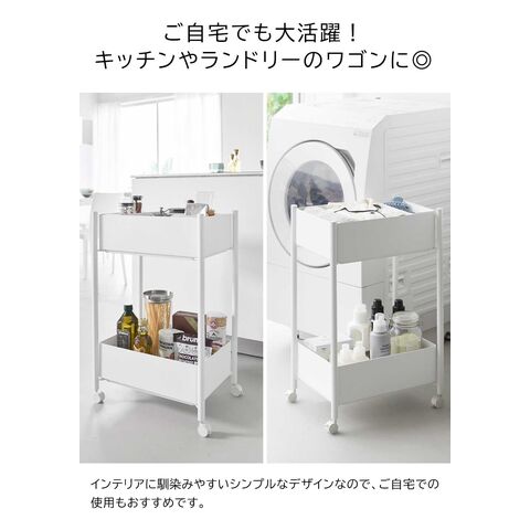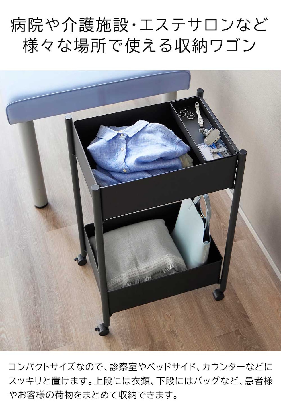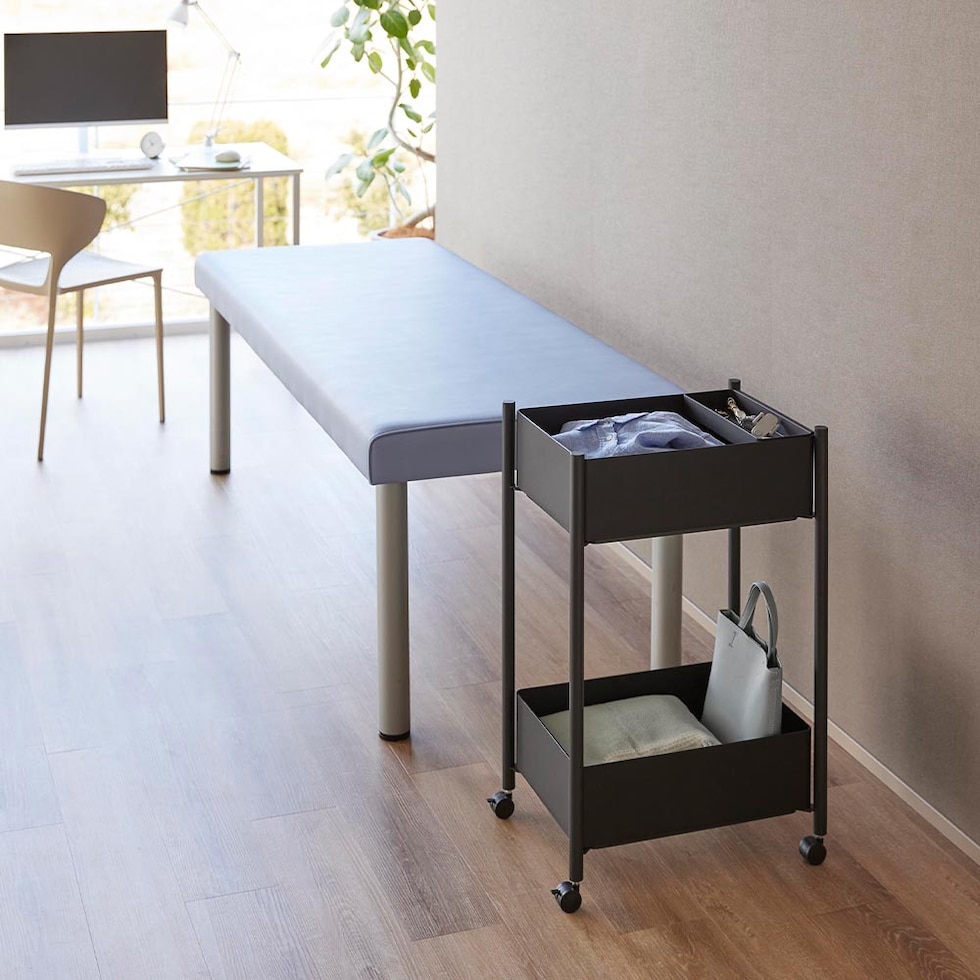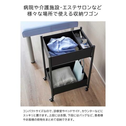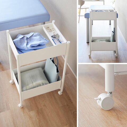 病院や介護施設、エステサロンなどで便利に使える2段式ワゴン。 コンパクトサイズなので診察室やカウンターにスッキリと置け、移動がラクにできるキャスター付きです。 バスケットは上段・下段ともに取り外せます。ABS樹脂製で軽く、収納した衣類や貴重品をバスケットごと持ち運べます。 インテリアに馴染みやすいシンプルなデザインなので、ご自宅での使用もおすすめです。