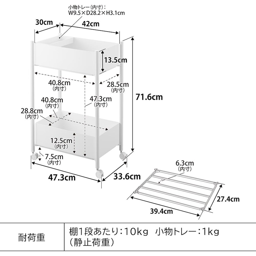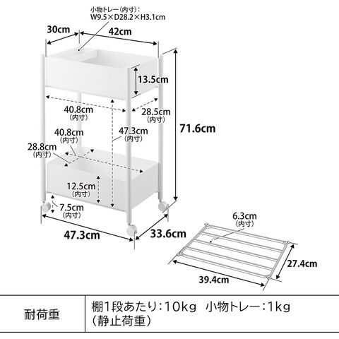 内寸サイズ バスケット1つあたり:W40.8×D28.8×H12.5cm 下段バスケット使用時の有効内寸(内底から上段棚下まで):H47.3cm 小物トレー:W9.5×D28.2×H3.1cm |