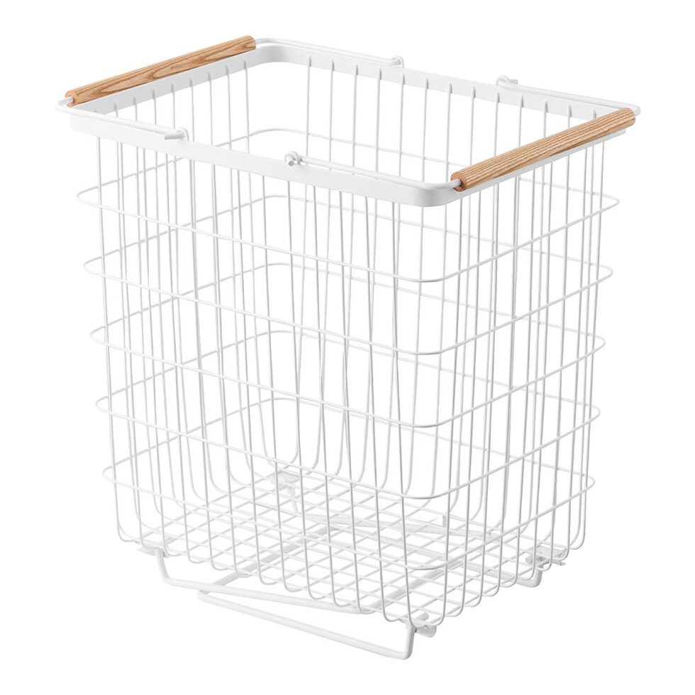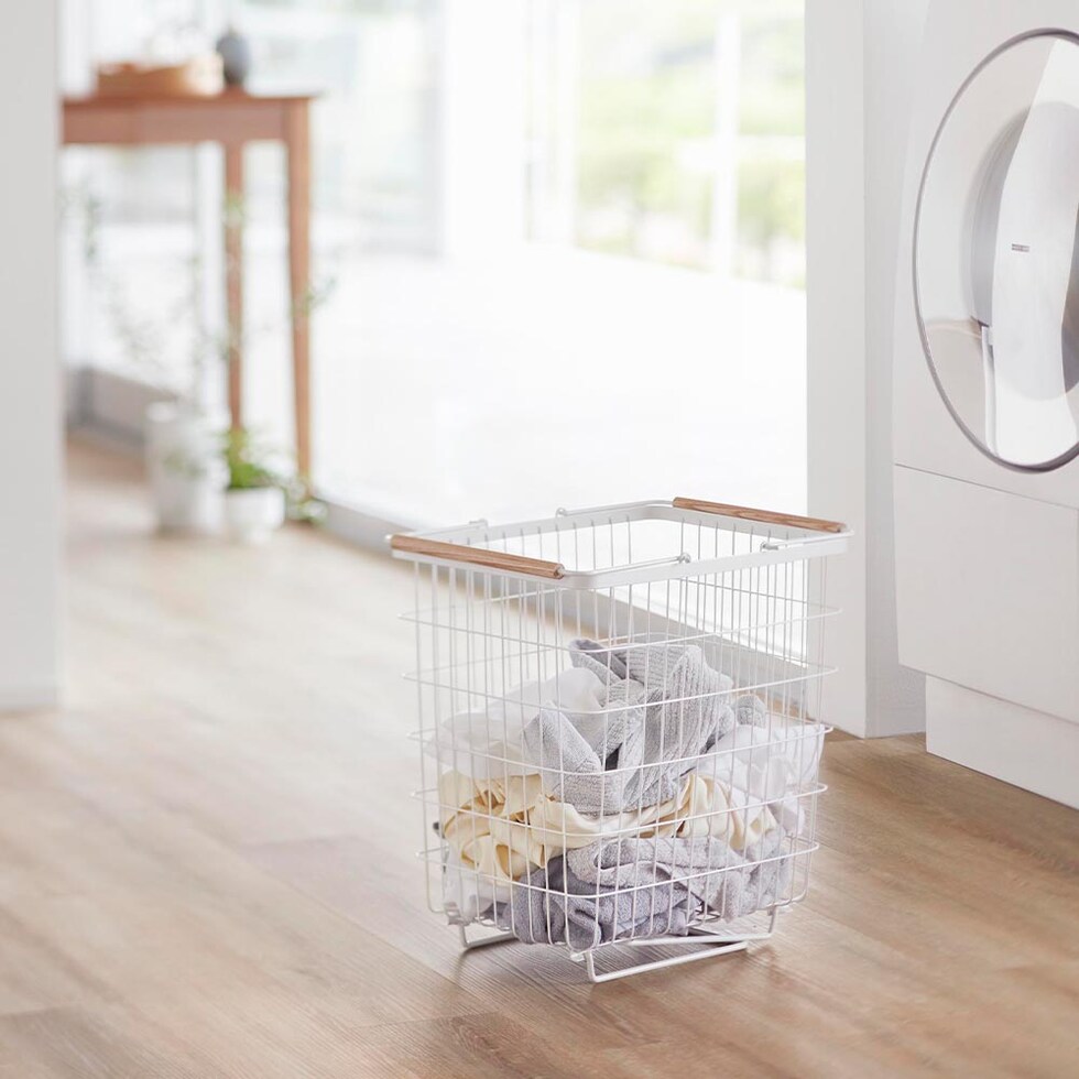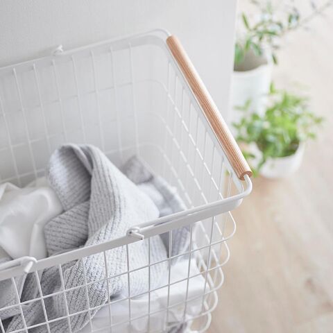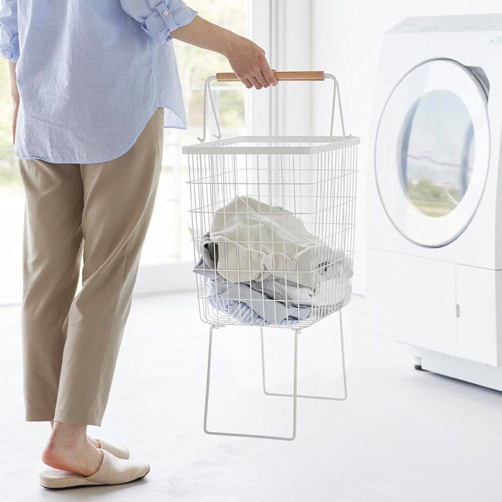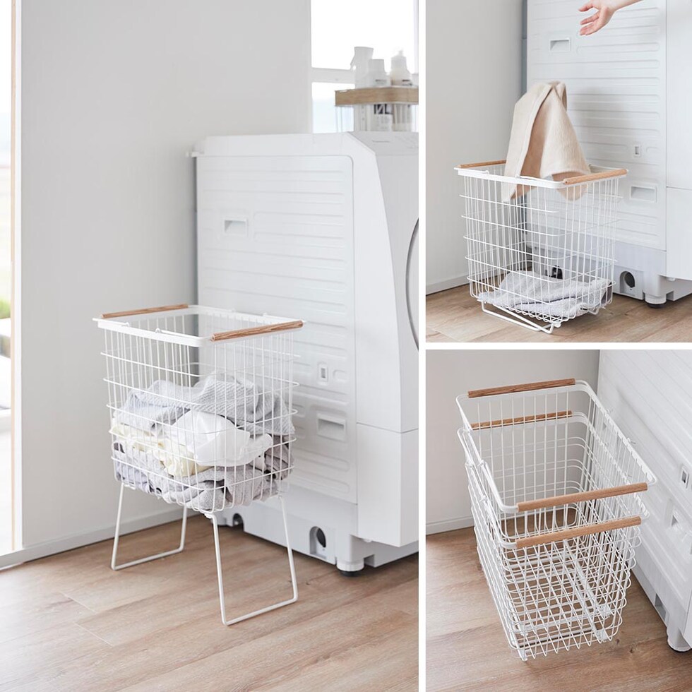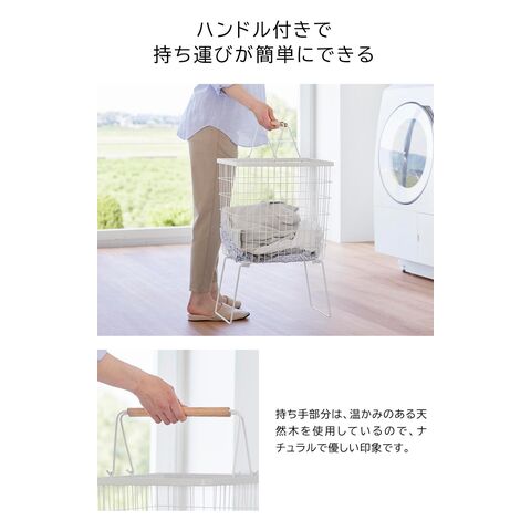 折り畳み可能な脚付きのランドリーバスケット。 折り畳まれた脚を広げるとバスケットの底面が高くなり、 体をかがめなくても洗濯物が簡単に取り出せます。 身体への負担が軽減し、洗濯物を干す作業もスムーズです。 脚を折り畳んだままでも使用可能。 ハンドル付きで持ち運びも簡単です。 持ち手部分は、温かみのある天然木を使用しているので、 ナチュラルで優しい印象のランドリーバスケットです。