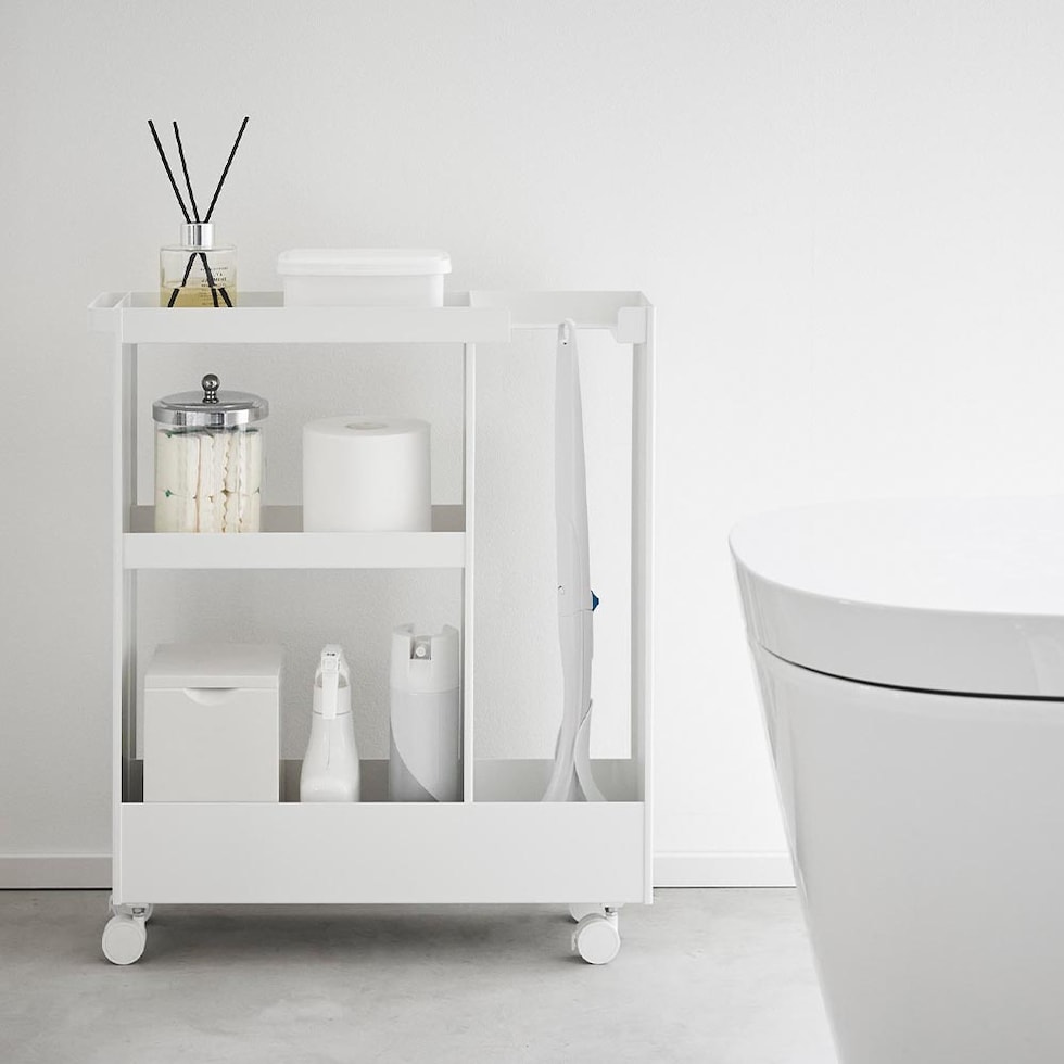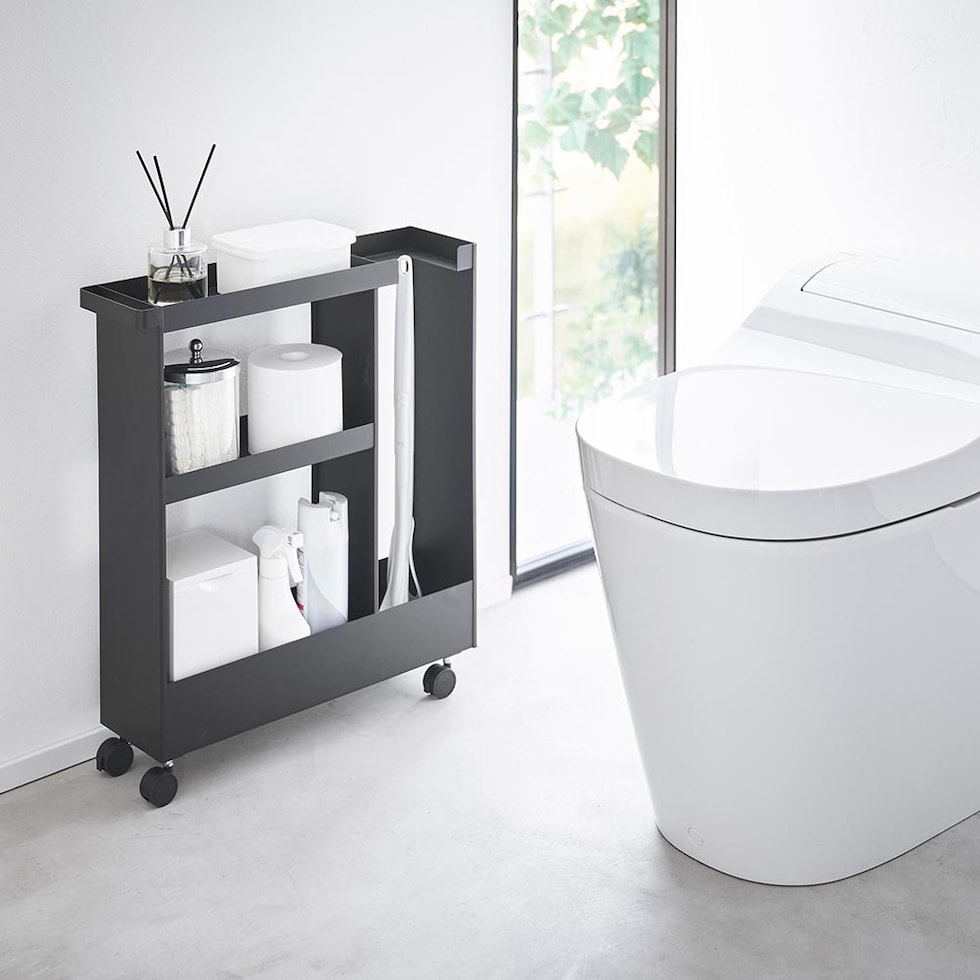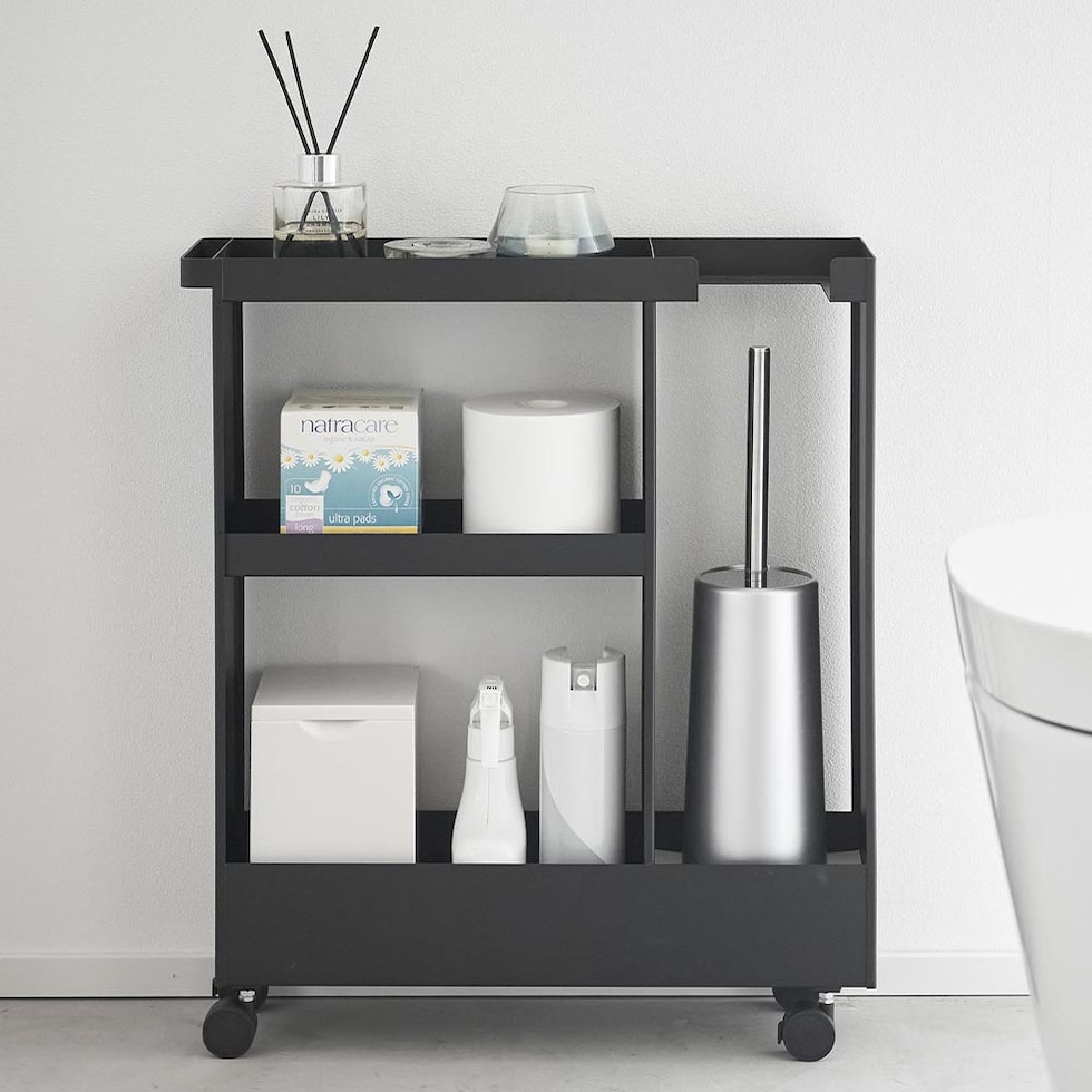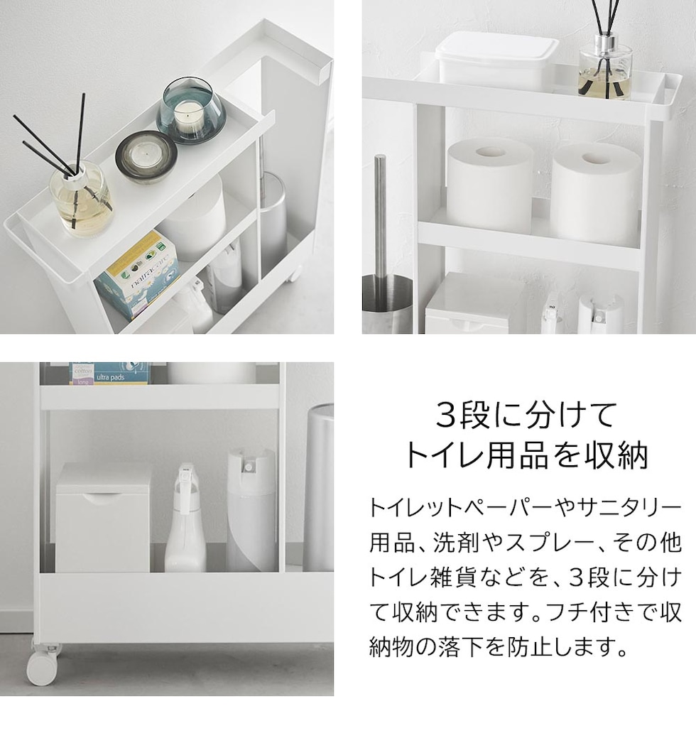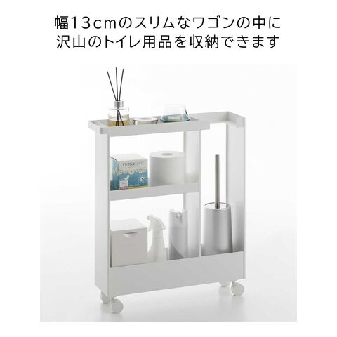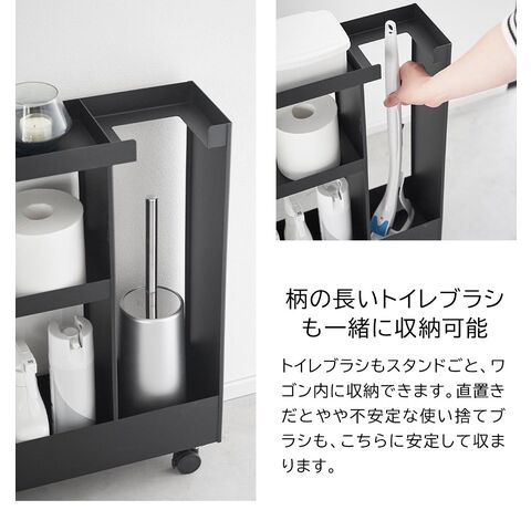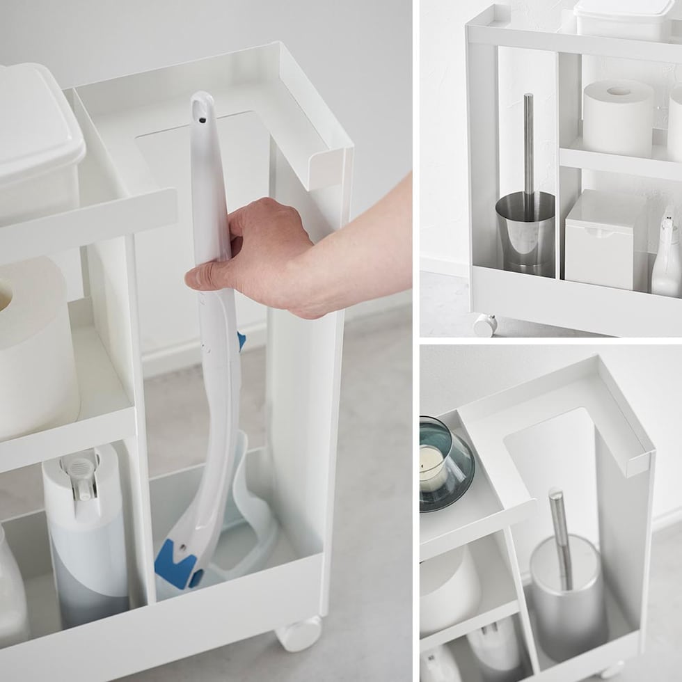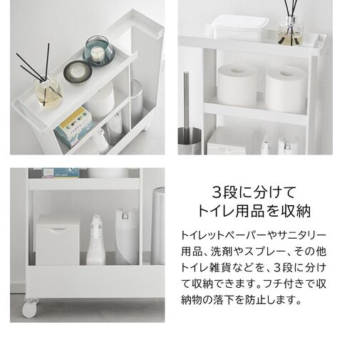 トイレットペーパーやサニタリー用品、トイレ用洗剤などと一緒に、高さのあるトイレブラシも収納できる、キャスター付きのスリムなワゴンです。 トイレ用品をスタイリッシュなワゴンにまとめて収納することで、機能的でスッキリと整ったトイレ空間を演出します。 使い捨てトイレブラシのような、細長くやや不安定なアイテムも、トイレブラシ収納エリアに安定して収まります。 様々な用途や形状のトイレ用品は、3段の棚に使いやすく分類できます。それぞれの棚にはフチが付いているので落下の心配もありません。 キャスターとハンドル付きだから、こまごまとしたトイレ用品を全て一緒に移動でき大変便利!物の出し入れやトイレ掃除の際に、ラクに移動できます。 付属のスパナでキャスターを取り付けるだけの簡単組み立てで、購入後すぐに使用できます。