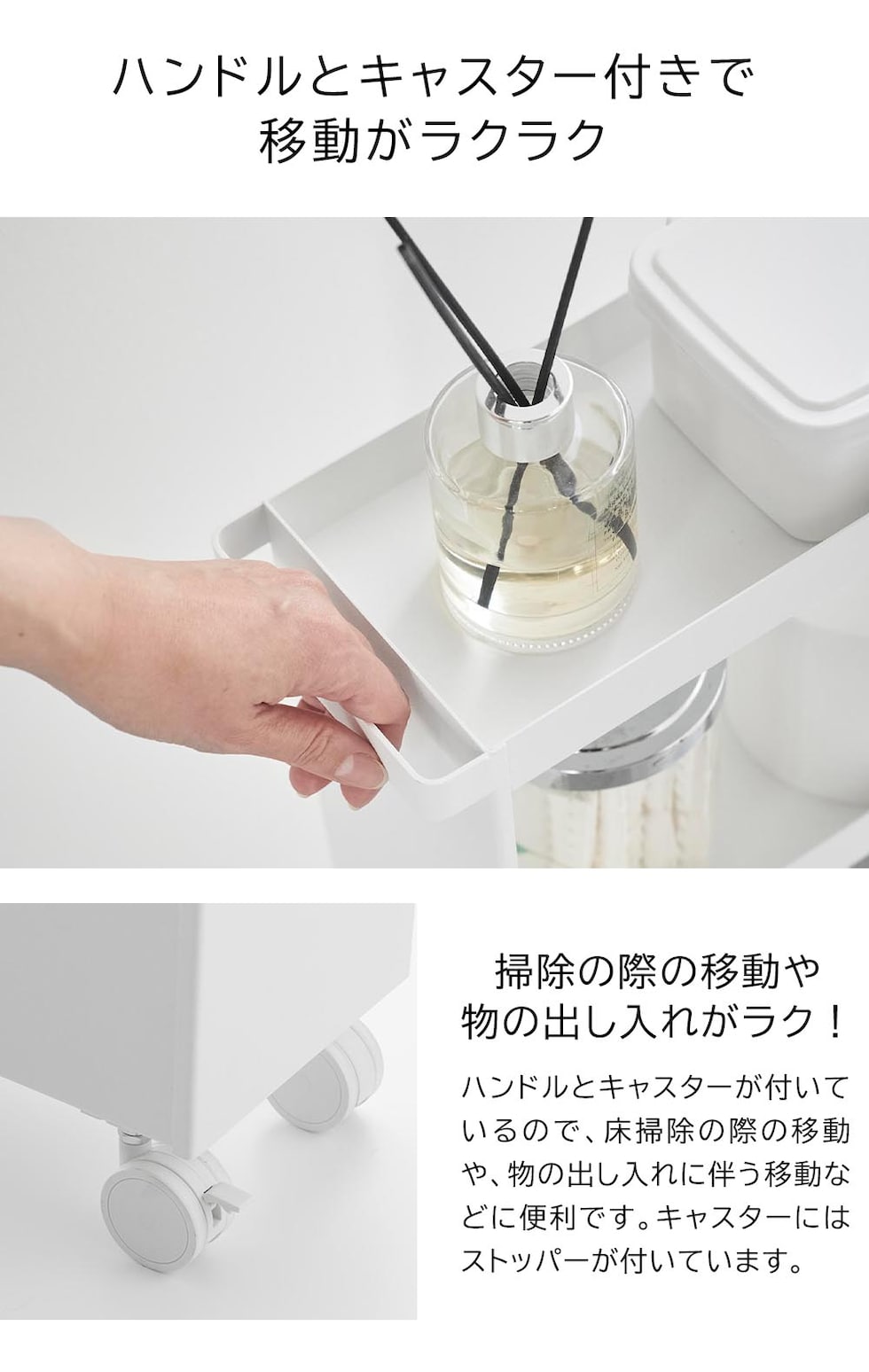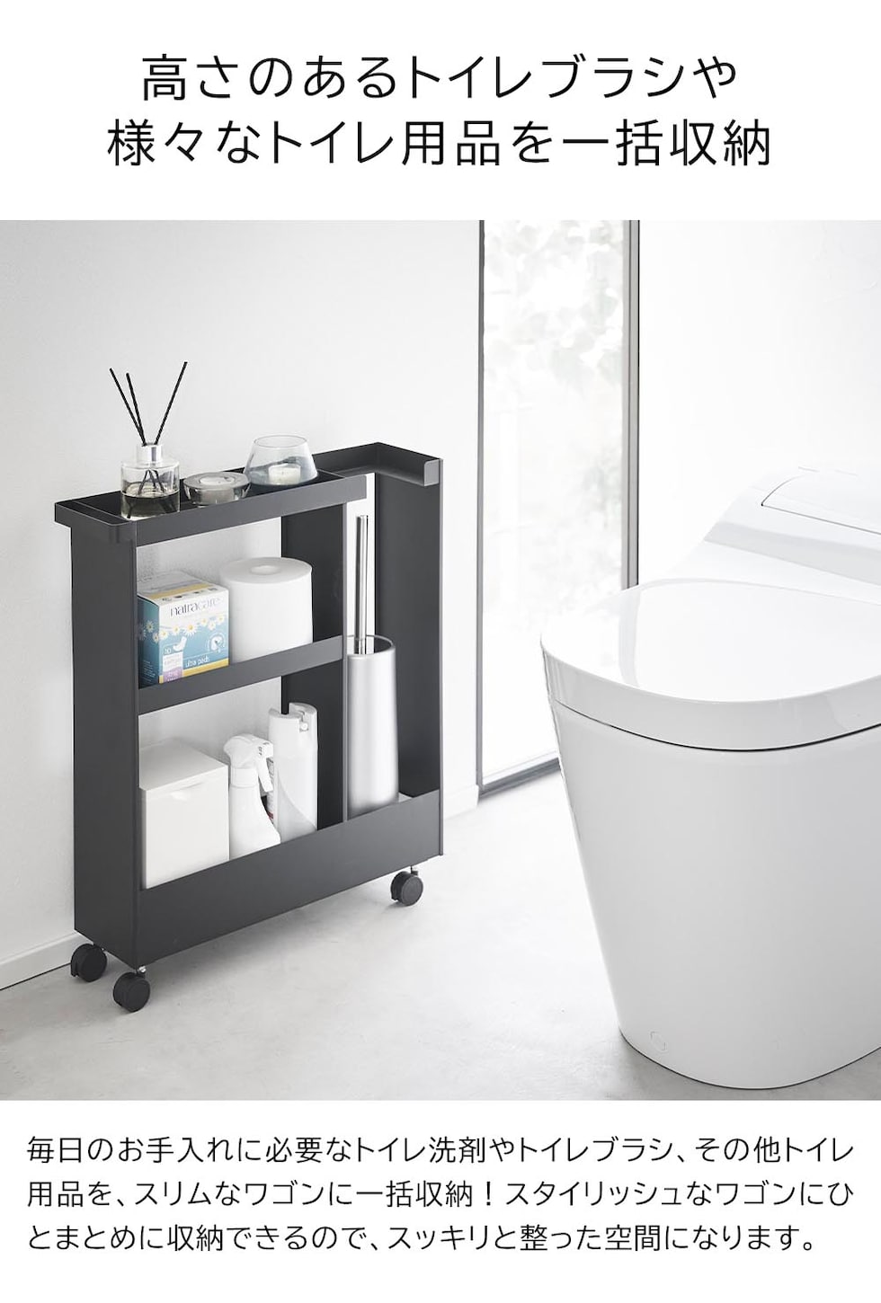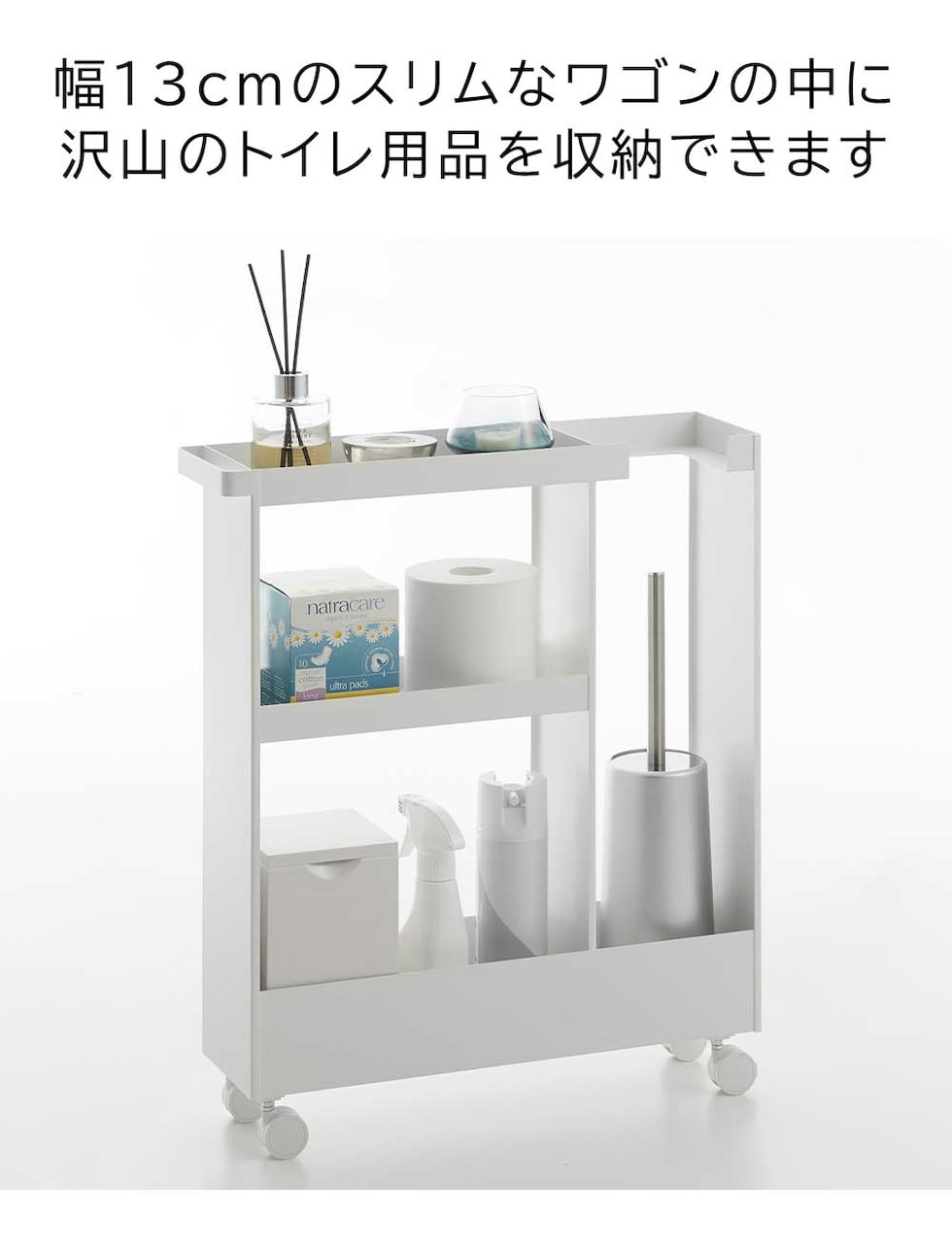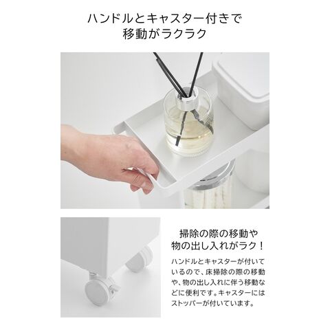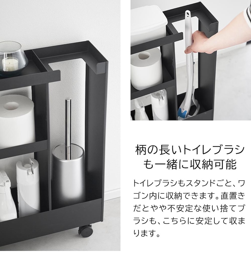 トイレットペーパーやサニタリー用品、トイレ用洗剤などと一緒に、高さのあるトイレブラシも収納できる、キャスター付きのスリムなワゴンです。 トイレ用品をスタイリッシュなワゴンにまとめて収納することで、機能的でスッキリと整ったトイレ空間を演出します。 使い捨てトイレブラシのような、細長くやや不安定なアイテムも、トイレブラシ収納エリアに安定して収まります。 様々な用途や形状のトイレ用品は、3段の棚に使いやすく分類できます。それぞれの棚にはフチが付いているので落下の心配もありません。 キャスターとハンドル付きだから、こまごまとしたトイレ用品を全て一緒に移動でき大変便利!物の出し入れやトイレ掃除の際に、ラクに移動できます。 付属のスパナでキャスターを取り付けるだけの簡単組み立てで、購入後すぐに使用できます。