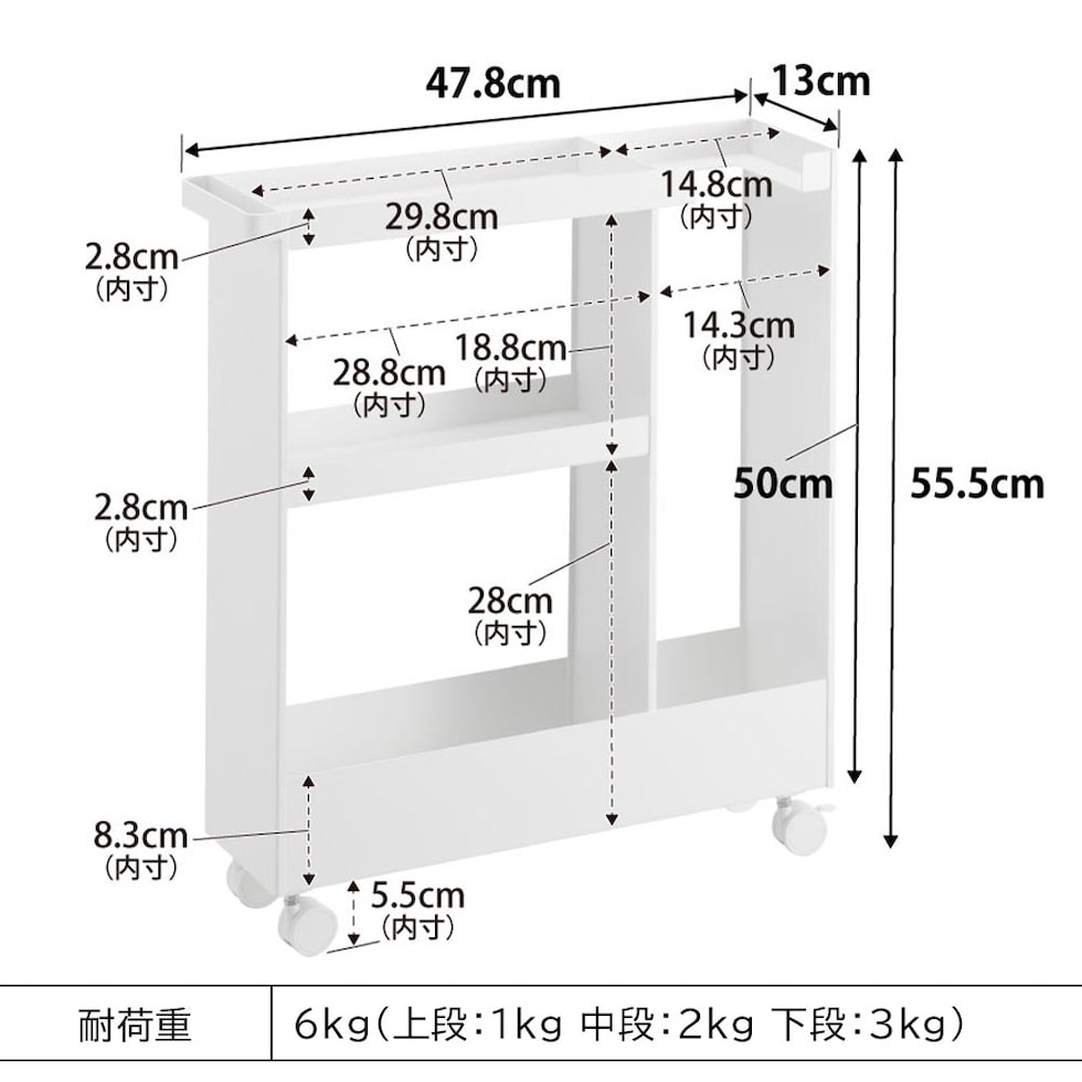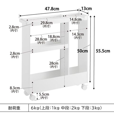 耐荷重 6kg(上段:1kg 中段:2kg 下段:3kg) |