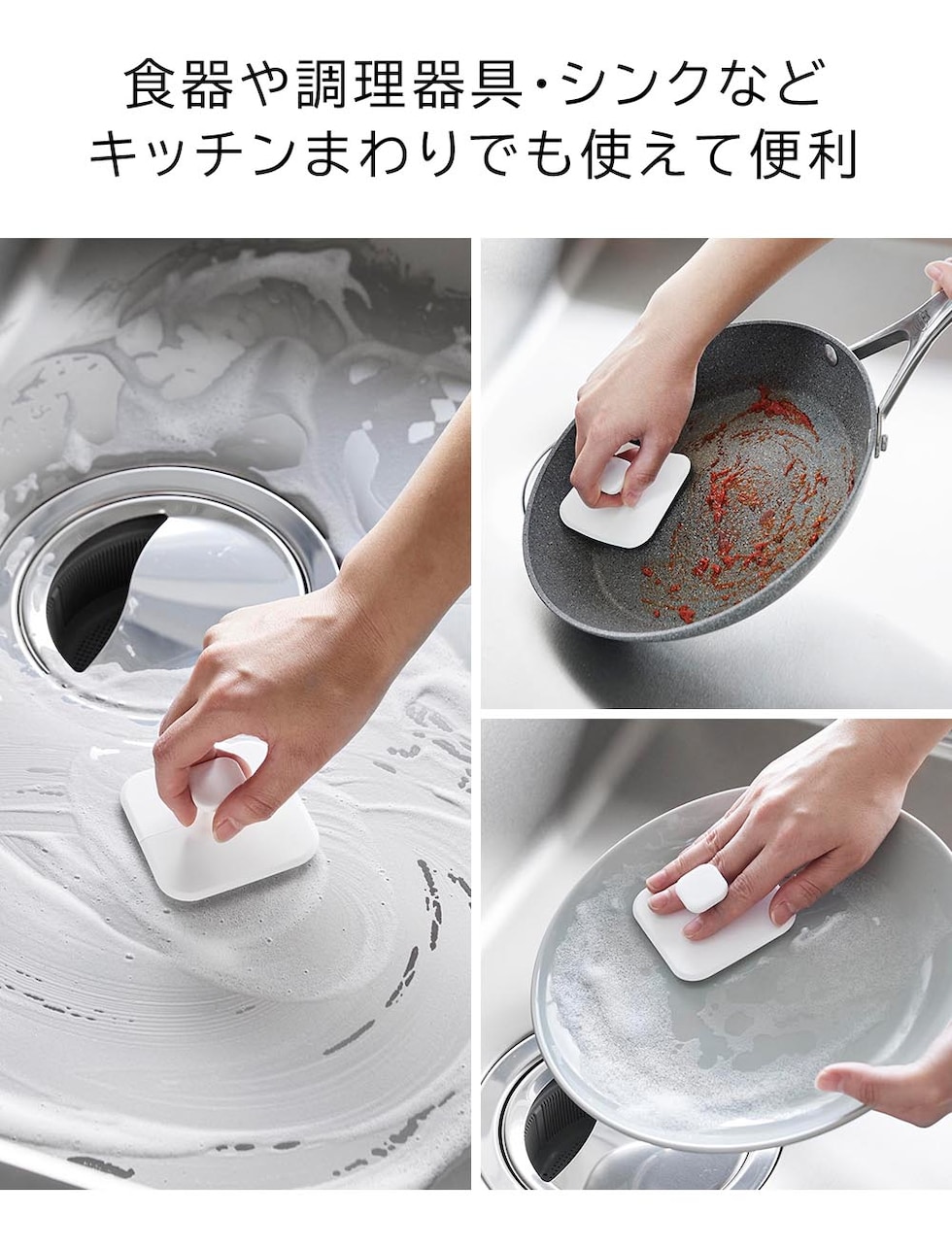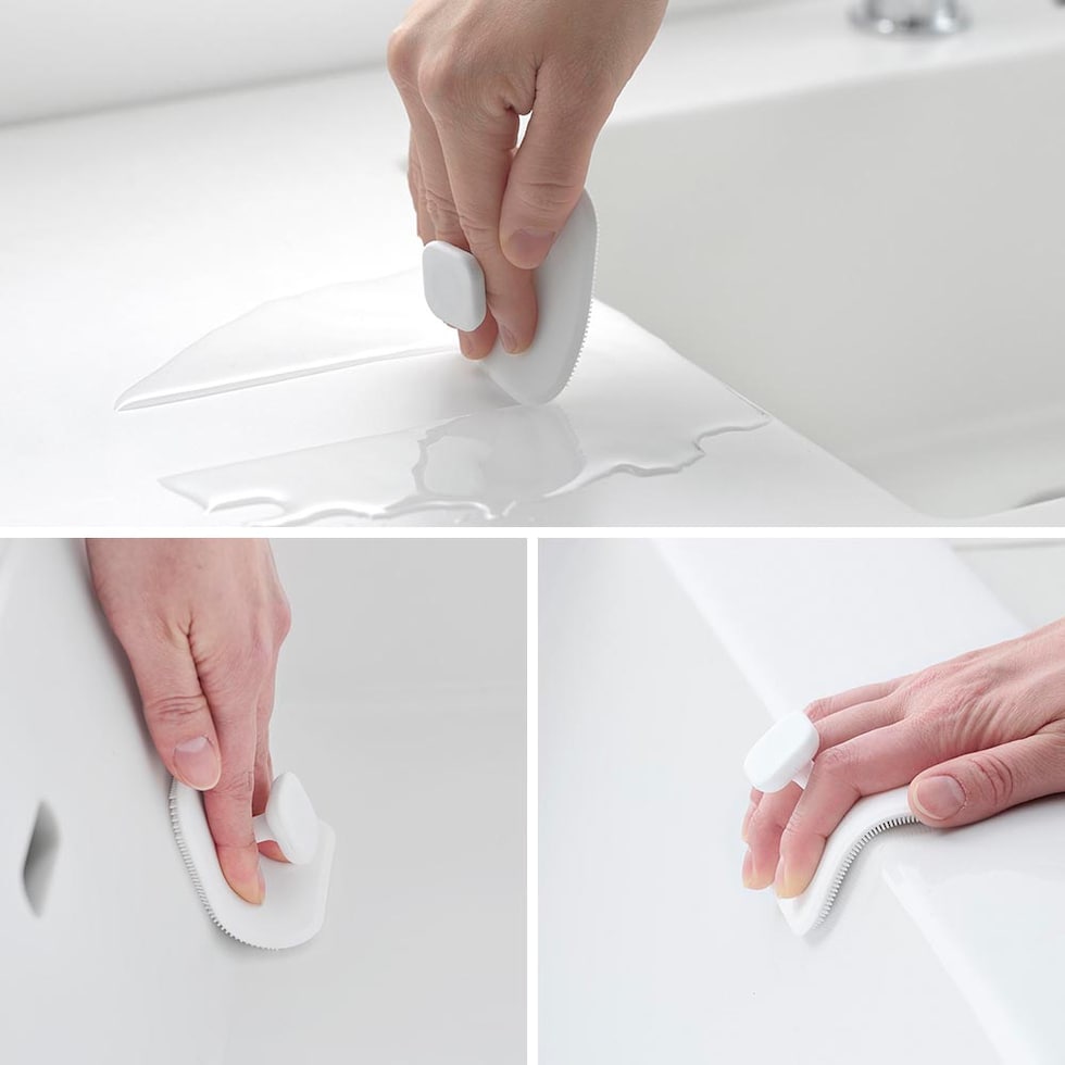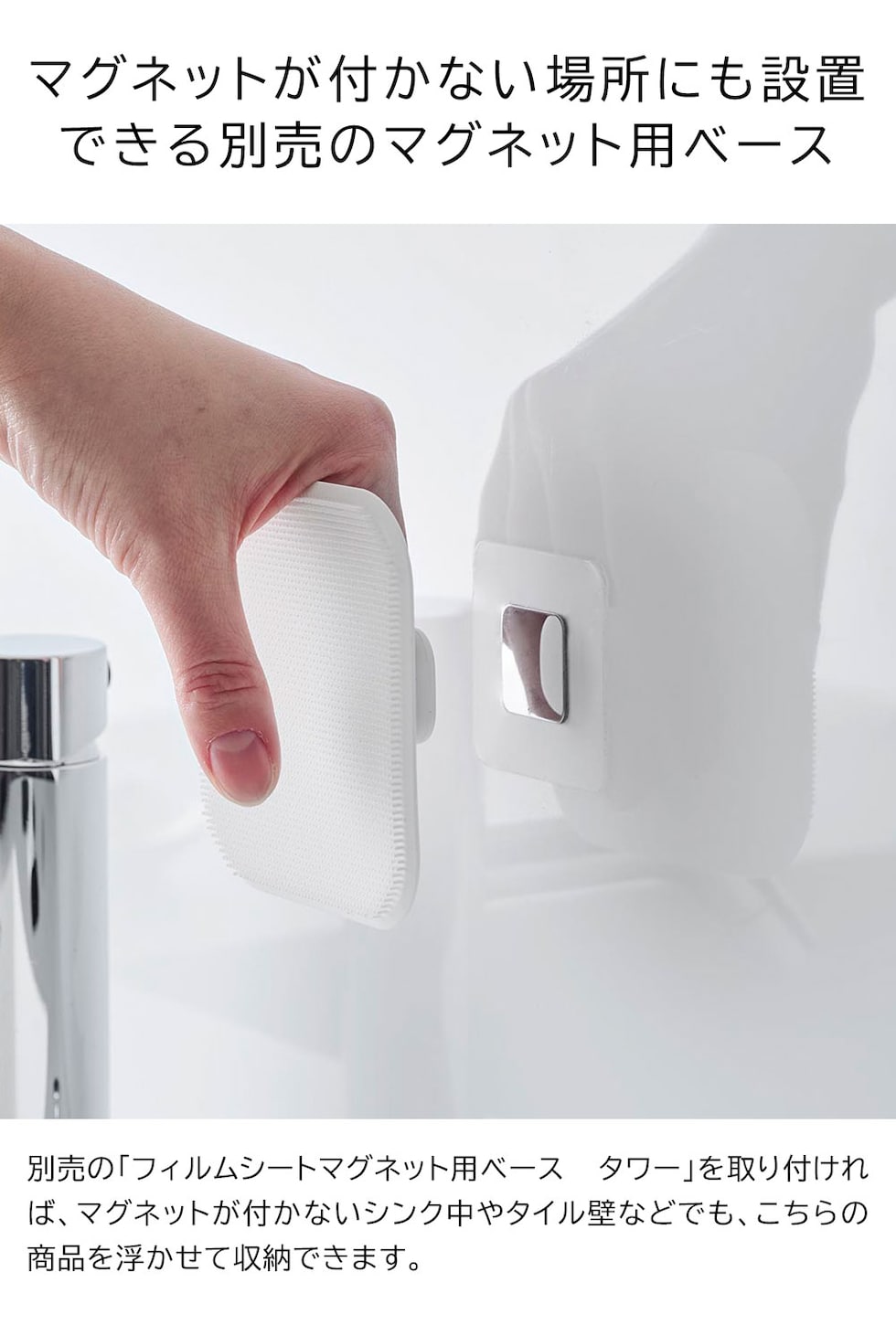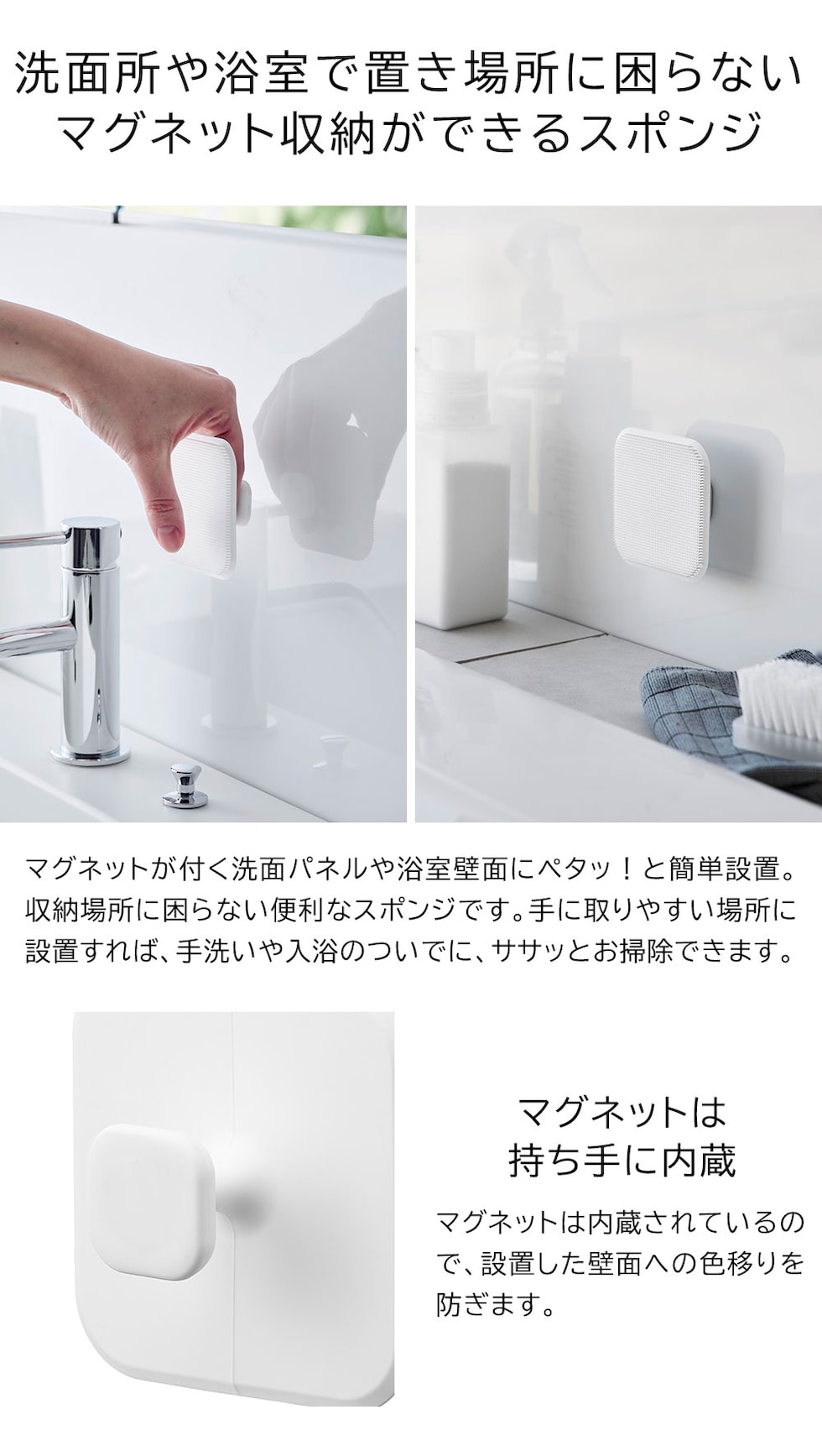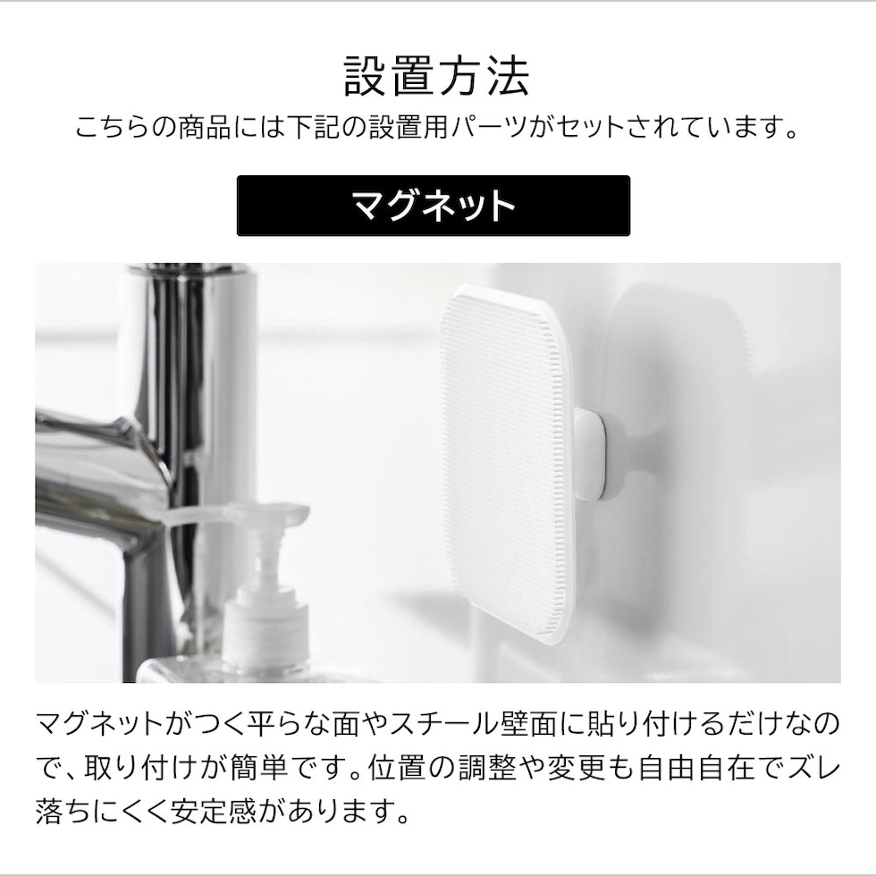・マグネットで浮かせて収納!泡立ち良くしっかり洗えるシリコーン製スポンジ ・マグネットで壁面に収納できるので、汚れに気づいた時にサッとお掃除 ・柔らかいシリコンがカーブにフィット ・乾きやすく、スポンジ面が壁面に接触しないので衛生的 ・使用後の洗面台の水切りとしても |