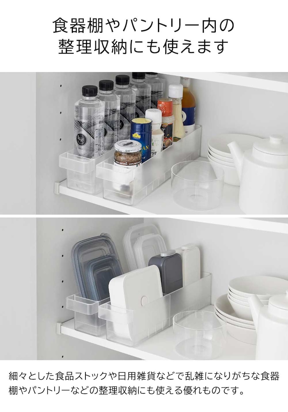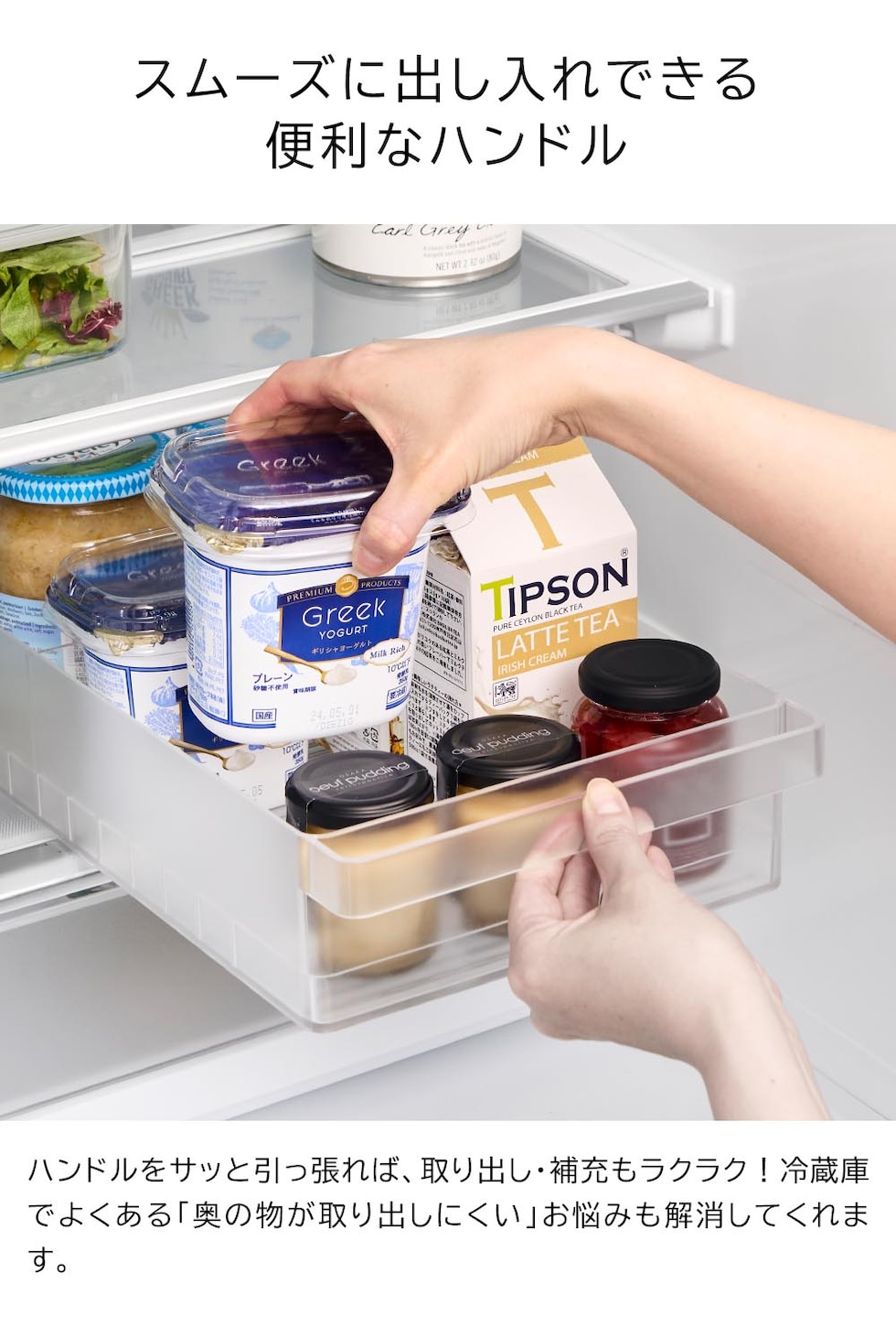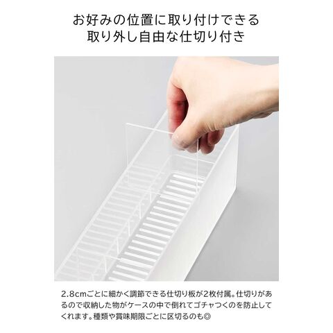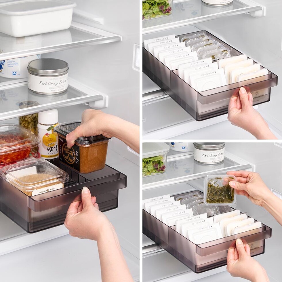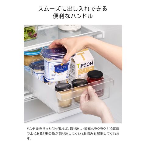 冷蔵庫中収納ケース タワー L 仕切り付き 冷蔵庫奥まで無駄なく使えるスリム冷蔵庫中収納ケース 小さな紙パック飲料や乳酸菌飲料ボトルなどが収納できるスリムなSサイズと、味噌や漬物などの大きなパックをまとめて収納できる大容量Lサイズの冷蔵庫中収納ケースです。 冷蔵庫の奥まで無駄なく使えて、スッキリと整理できます。ケースは引き出しがスムーズにできるハンドル付きで、冷蔵庫奥にしまった取り出しにくい物もラクに取り出せ、食品の補充も簡単にできます。 お好みの位置で仕切れる可動式の仕切りが2枚付属。冷蔵庫の中以外にも食器棚やパントリー内の整理収納用ケースとしてもおすすめです。 イメージとしてS/Lサイズそれぞれ複数個を使用した写真を掲載しております。 ![]() ![]() ![]() ![]() ![]() ![]() ![]() ![]() ![]() ![]() |