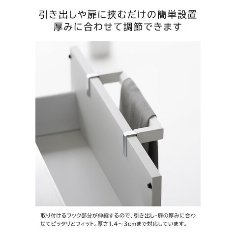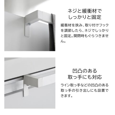 ■取り付け可能な引き出し・扉 幅36cm以上(扉のハンドル等を含まず) 厚さ:1.4~3cm以内 上部との隙間:0.3cm以上 ※本製品は屋内の一般的な平面の流し台や洗面台を対象にしています。 ※ガラス戸やキズつきやすい設置場所でのご使用はお避けください。 ※サイズや厚み、形状、材質によっては取り付けできない場合があります。 |