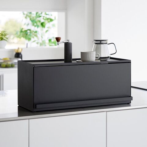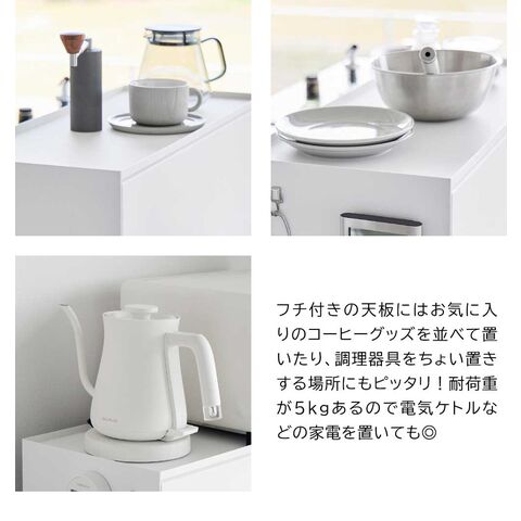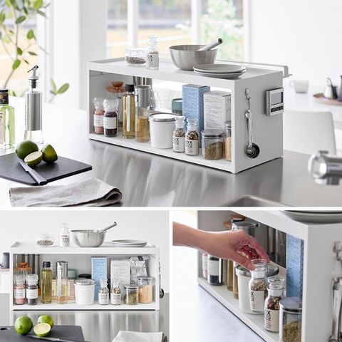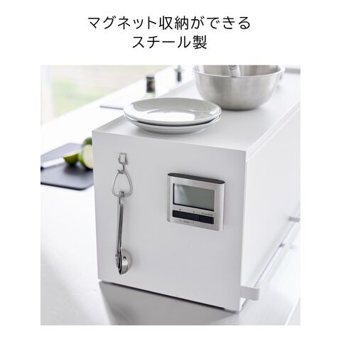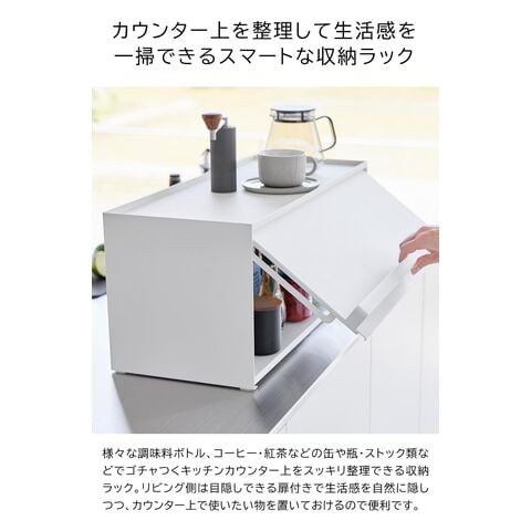 前が開くキッチンカウンター上収納ラック タワー D24 リビング側はスッキリ目隠し キッチン側は使いやすいカウンター上収納ラック カウンター上のゴチャつきをスッキリと整理して、生活感を一掃してくれるカウンター上収納ラックです。リビング側は全面が開くフラップ式の扉付きで、使いたい時にだけ中の物を取り出し、使い終わったらサッと扉を閉めて目隠しできます。リビングにいながら中の物が取り出せるので、わざわざキッチン側に移動する手間が省けます。 キッチン側は扉がないので調理中でも物の出し入れがしやすく、後片付けもラクラク。ラック上はフチ付きの天板になっているので、お気に入りのコーヒーセットやカトラリーを並べて置いたり、調理器具をちょい置きしたりとマルチに活躍。 ラックはスチール製なので、マグネット付きのキッチンタイマーやフックをつけても便利。また壁際に設置してブレッドケースとして使っても◎ |