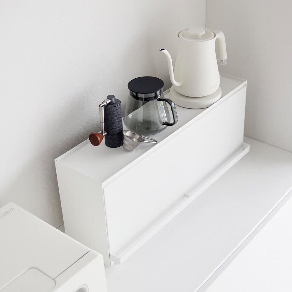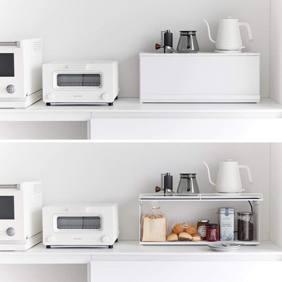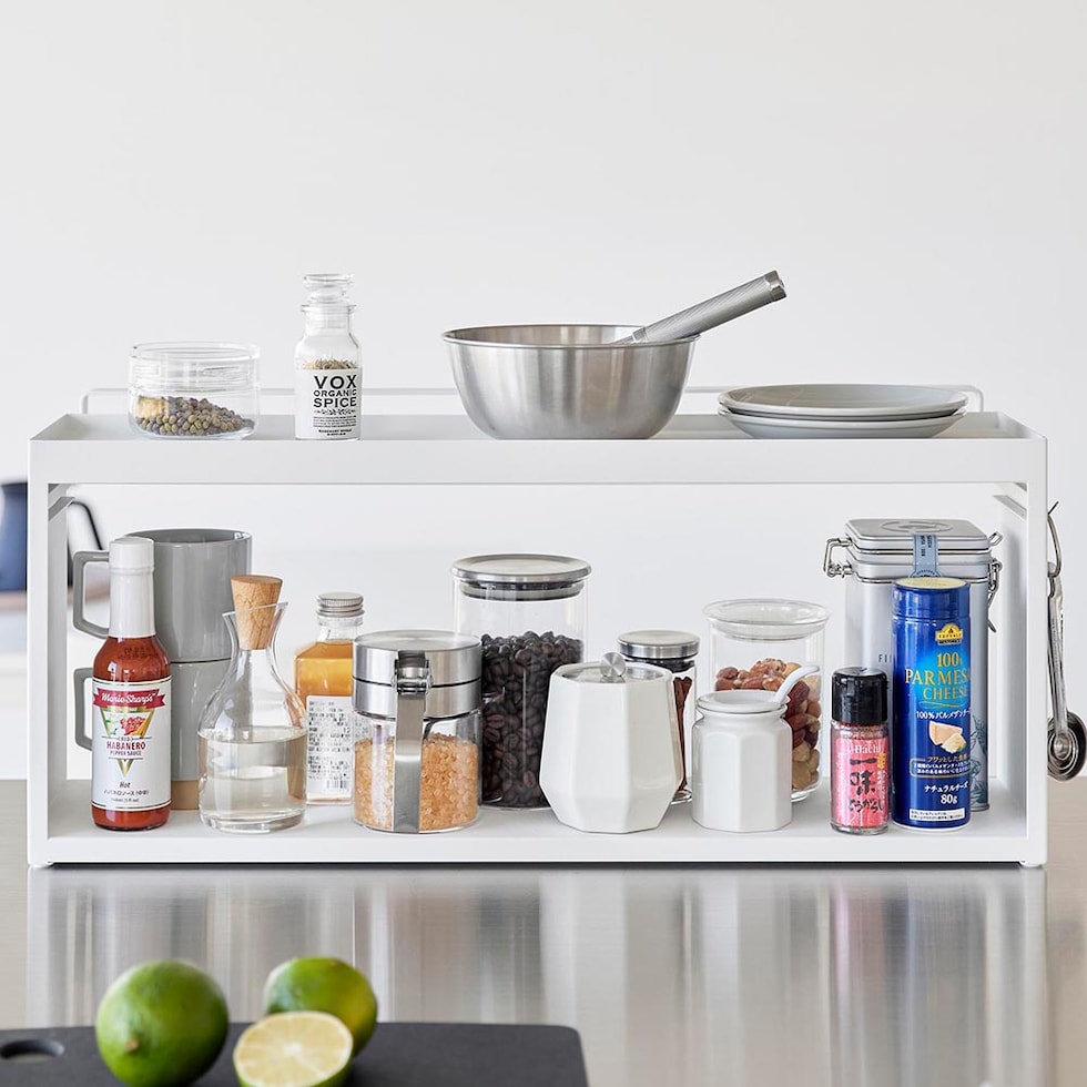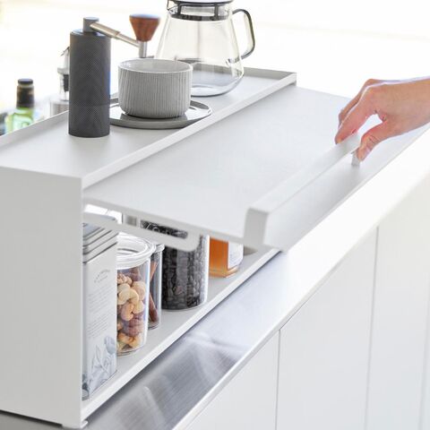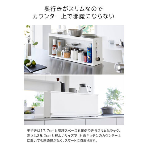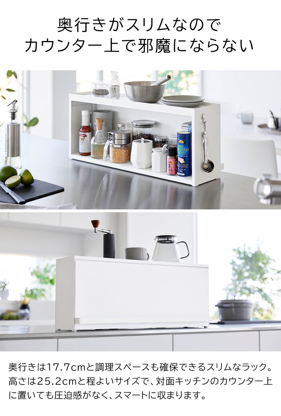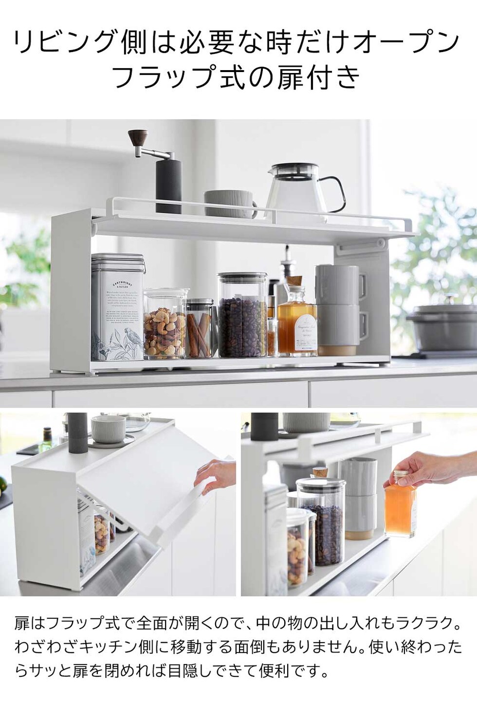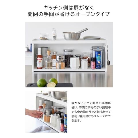 前が開くキッチンカウンター上収納ラック タワー D15 リビング側はスッキリ目隠し キッチン側は使いやすいカウンター上収納ラック カウンター上のゴチャつきをスッキリと整理して、生活感を一掃してくれるカウンター上収納ラックです。リビング側は全面が開くフラップ式の扉付きで、使いたい時にだけ中の物を取り出し、使い終わったらサッと扉を閉めて目隠しできます。リビングにいながら中の物が取り出せるので、わざわざキッチン側に移動する手間が省けます。 キッチン側は扉がないので調理中でも物の出し入れがしやすく、後片付けもラクラク。ラック上はフチ付きの天板になっているので、お気に入りのコーヒーセットやカトラリーを並べて置いたり、調理器具をちょい置きしたりとマルチに活躍。 ラックはスチール製なので、マグネット付きのキッチンタイマーやフックをつけても便利。また壁際に設置してブレッドケースとして使っても◎ |