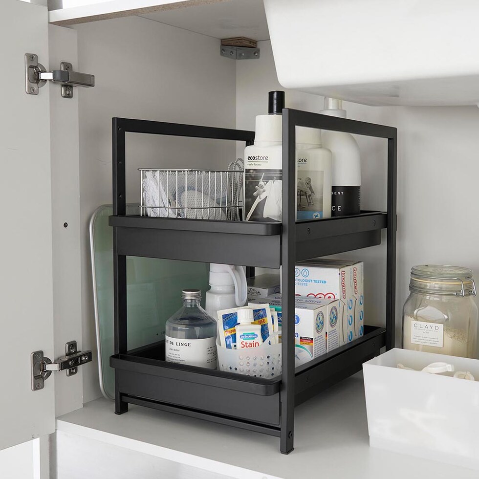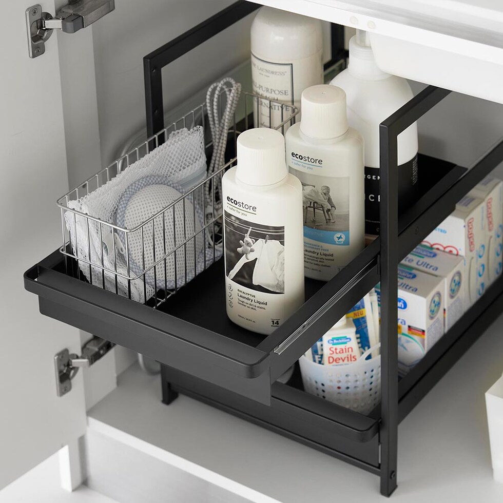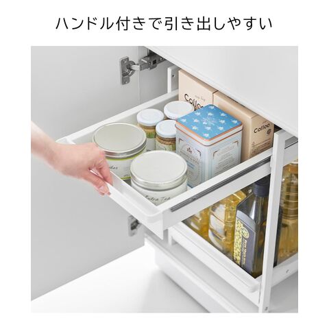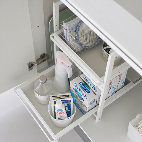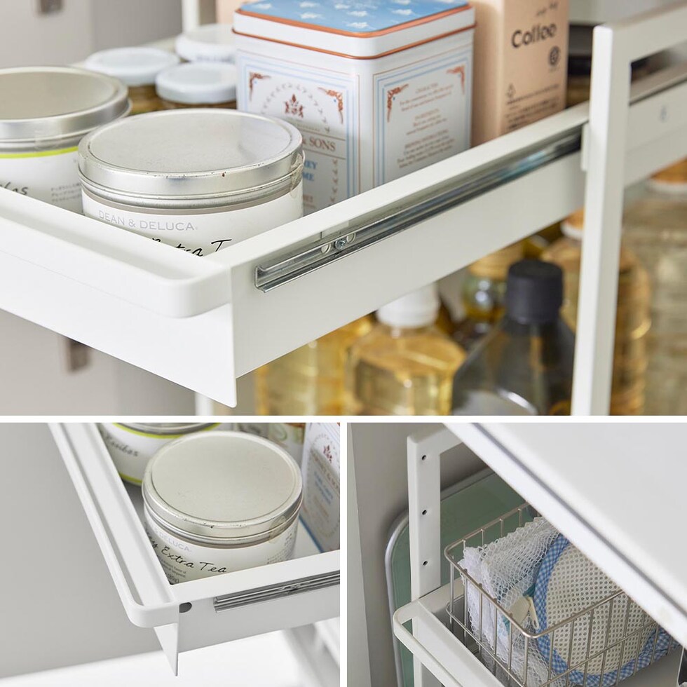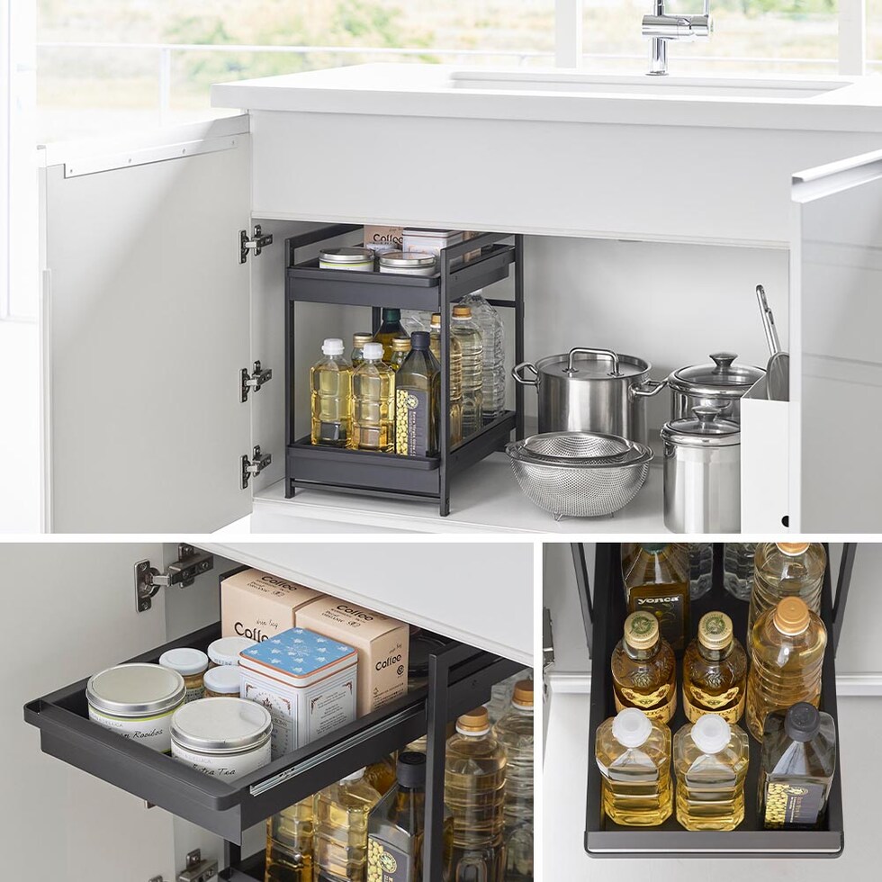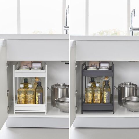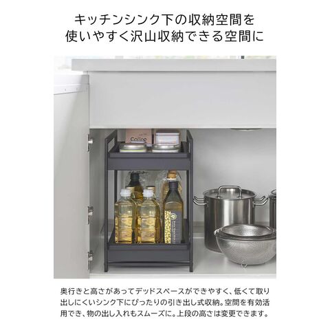 シンク下スライドラック タワー 2段 シンク下の空間を無駄なく活用!大容量で使いやすい引き出し式2段ラック 低い位置にあり、奥行きと高さがあるシンク下の収納スペースは、物の出し入れや整理がしにくく、空間も無駄にしがち。 こちらの2段のスライドラックを設置すれば、デッドスペースも有効活用して、使いやすい収納空間に変えることができます。 ハンドルを手前に引けば、スライドレールの付いたトレーが引き出され、直置きだと取り出しにくい奥の物もラクラク手に取ることができます。 上段のトレーは5cm刻みで4段階の高さ調節ができ、収納する物や置く場所に合わせて変更できます。キッチンシンク下以外にも、洗面台下の収納にも便利にお使いいただけます。 |