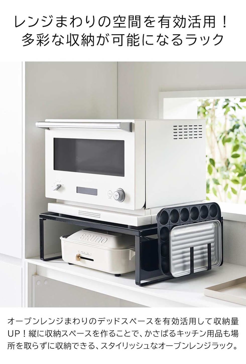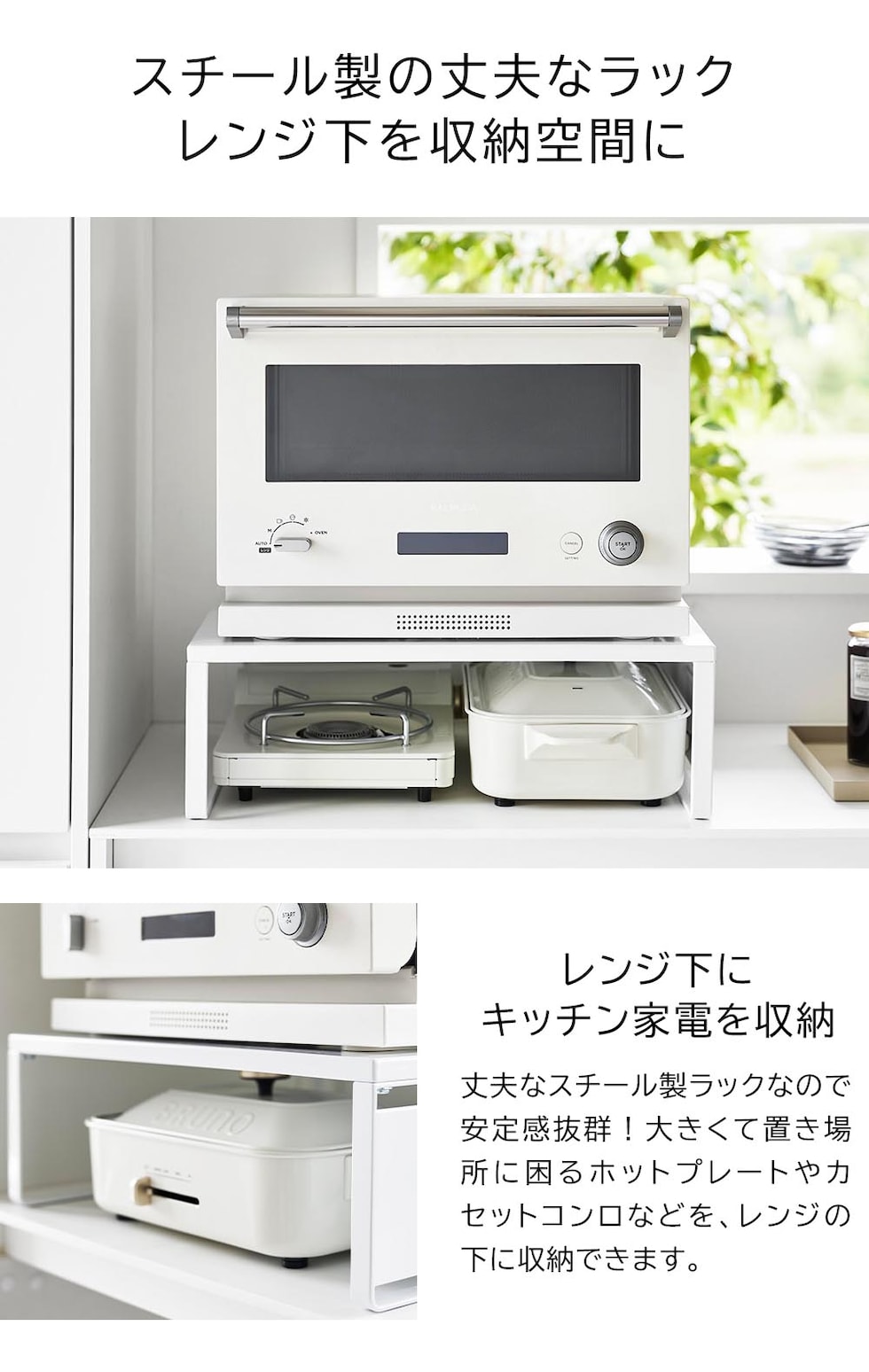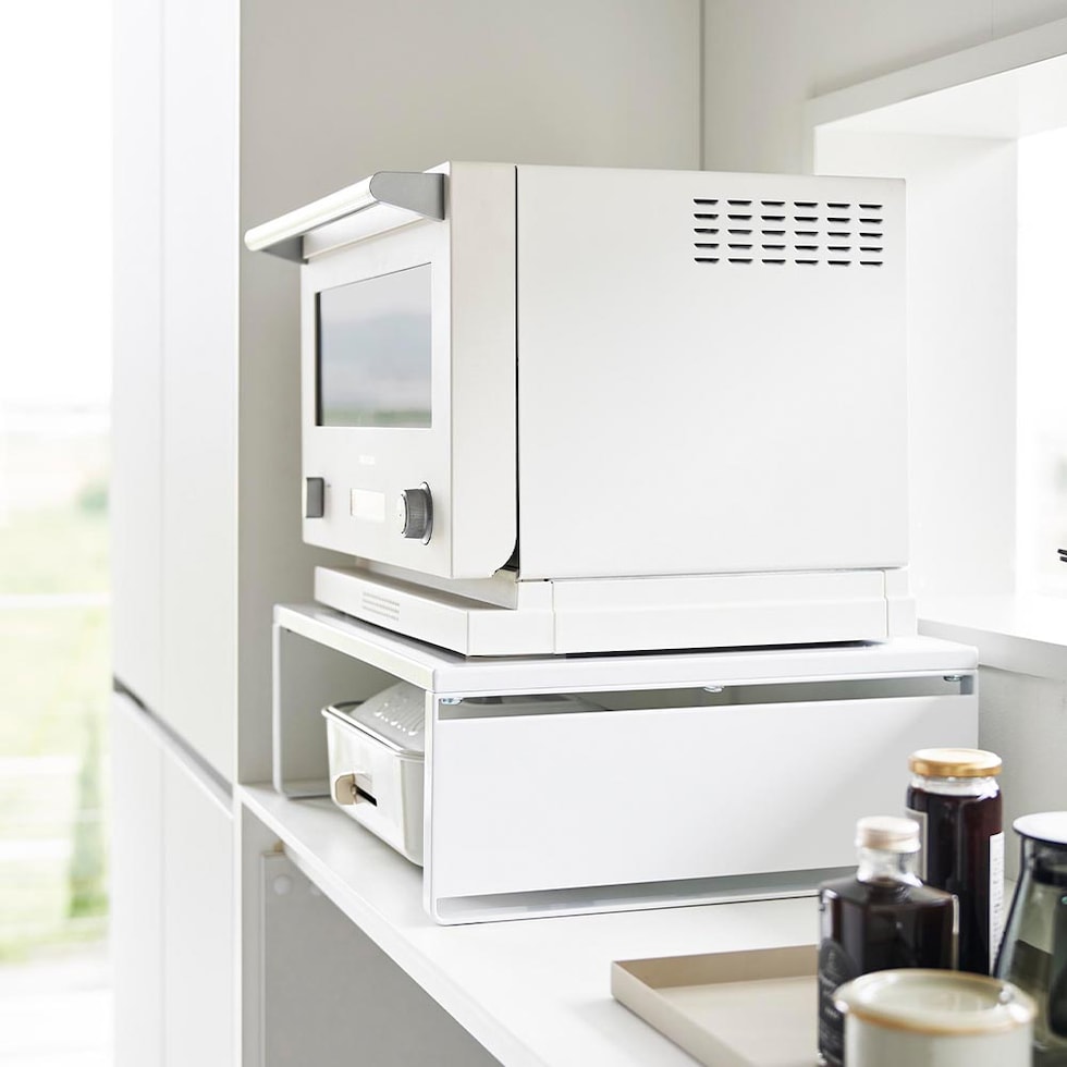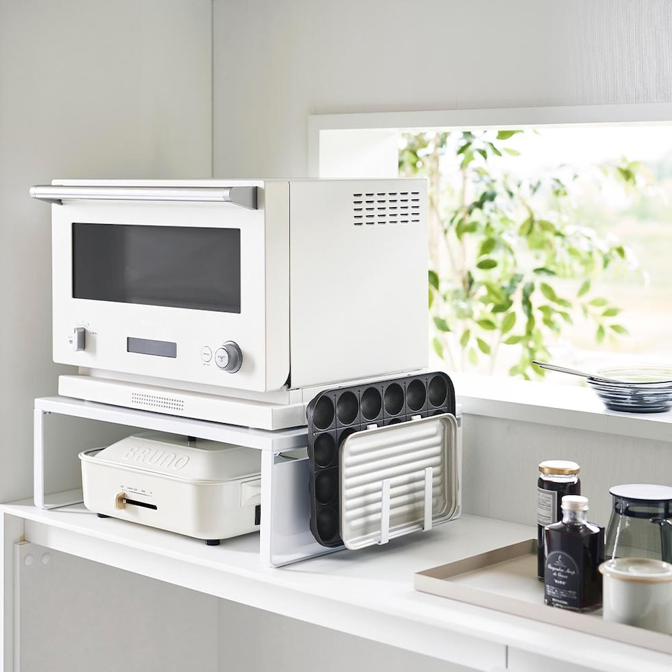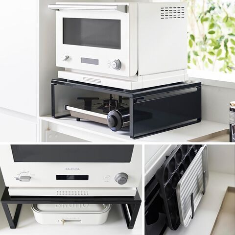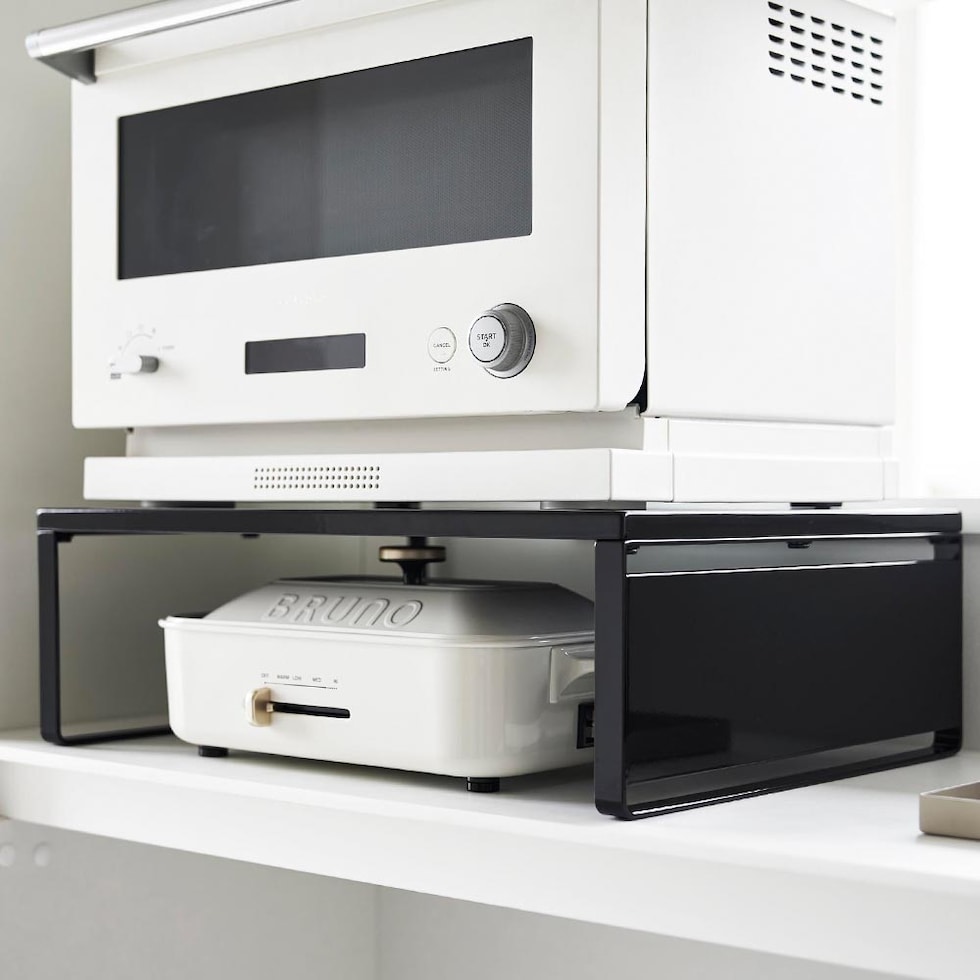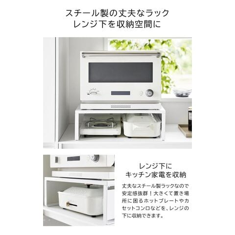 ホットプレートやカセットコンロなどの、大きくて置き場所に困るアイテムを、レンジ下に収納できるオーブンレンジラックです。レンジ上の縦のスペースを利用することで、新たな収納場所を探す必要がなくなり、また、出し入れしやすい場所にスマートに収納できます。