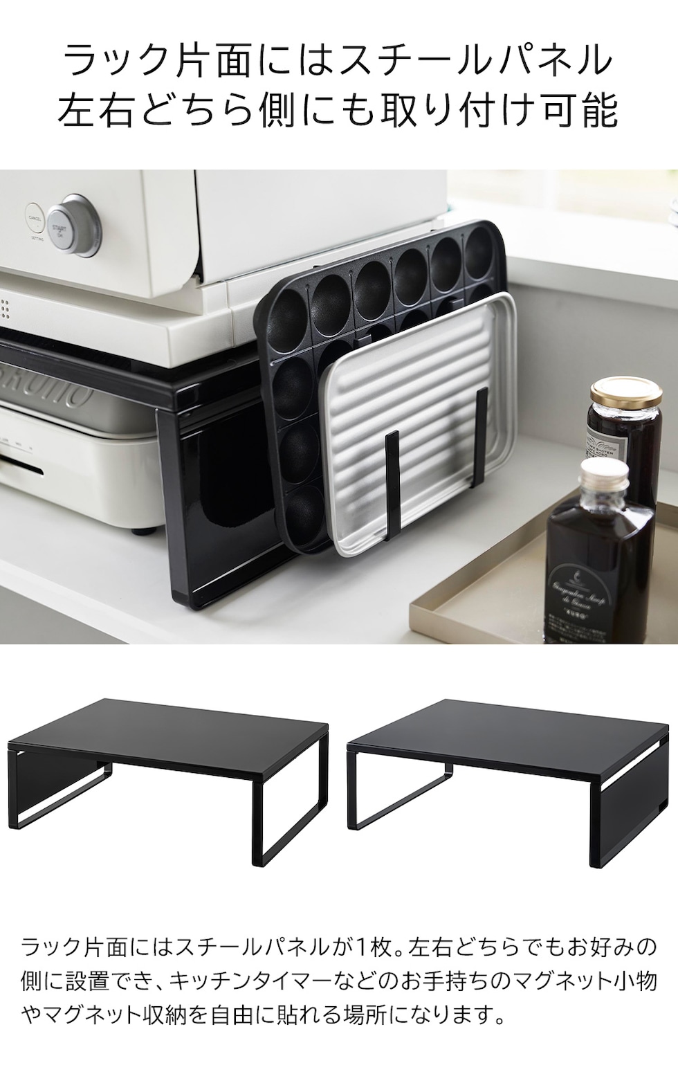 フレーム片面にはスチールパネルがついているので、お手持ちのマグネット収納グッズやキッチンタイマーなどのマグネット小物を自由に貼れます。スチールパネルが左右どちら側にも設置できるのも◎