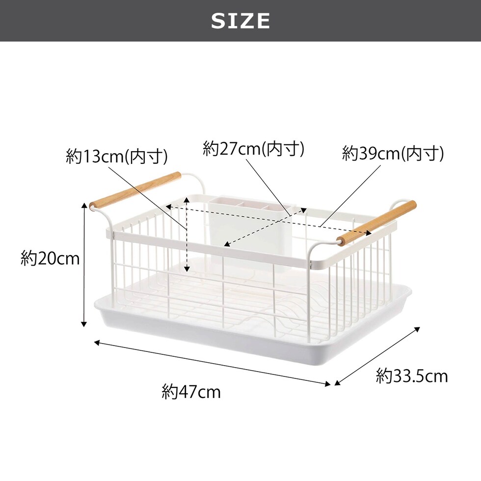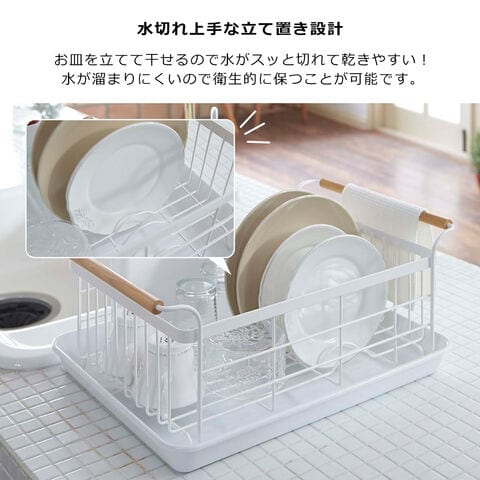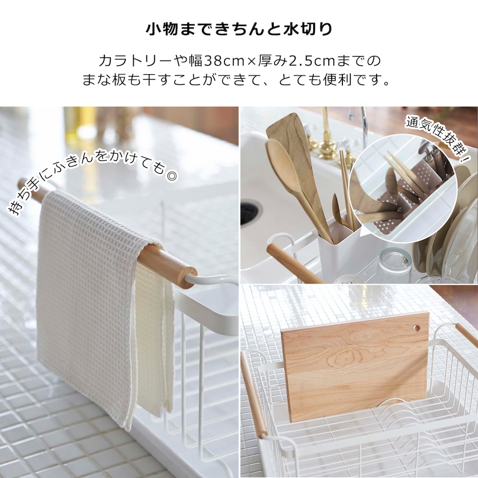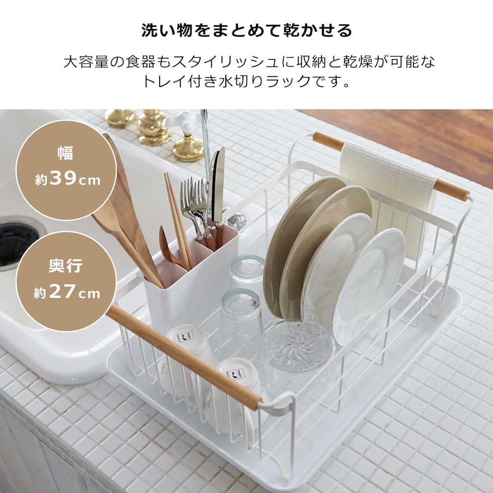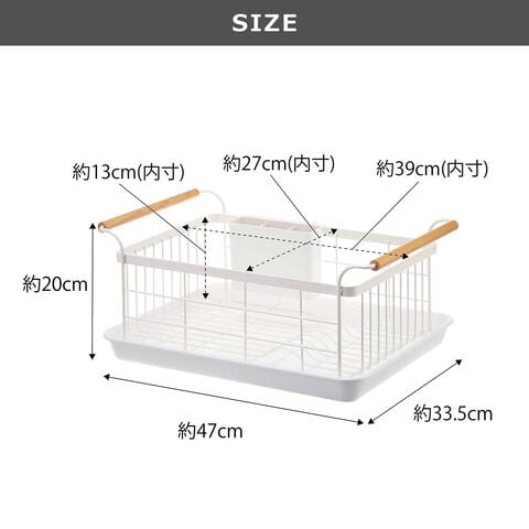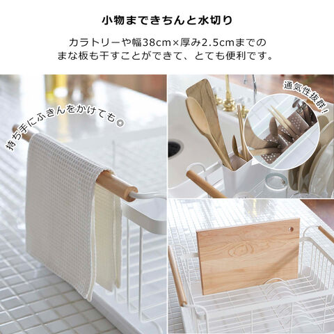 ・トレイ付きで大容量の洗い物も、すっきり干せるラック ・カゴの両側にある持ち手に布巾を干すことができます ・まな板やお皿を立てて干すことが出来て便利 ・カトラリーや小物なども、しっかり水切りできるポケット付き ・水が溜まりにくくお手入れ簡単♪ |