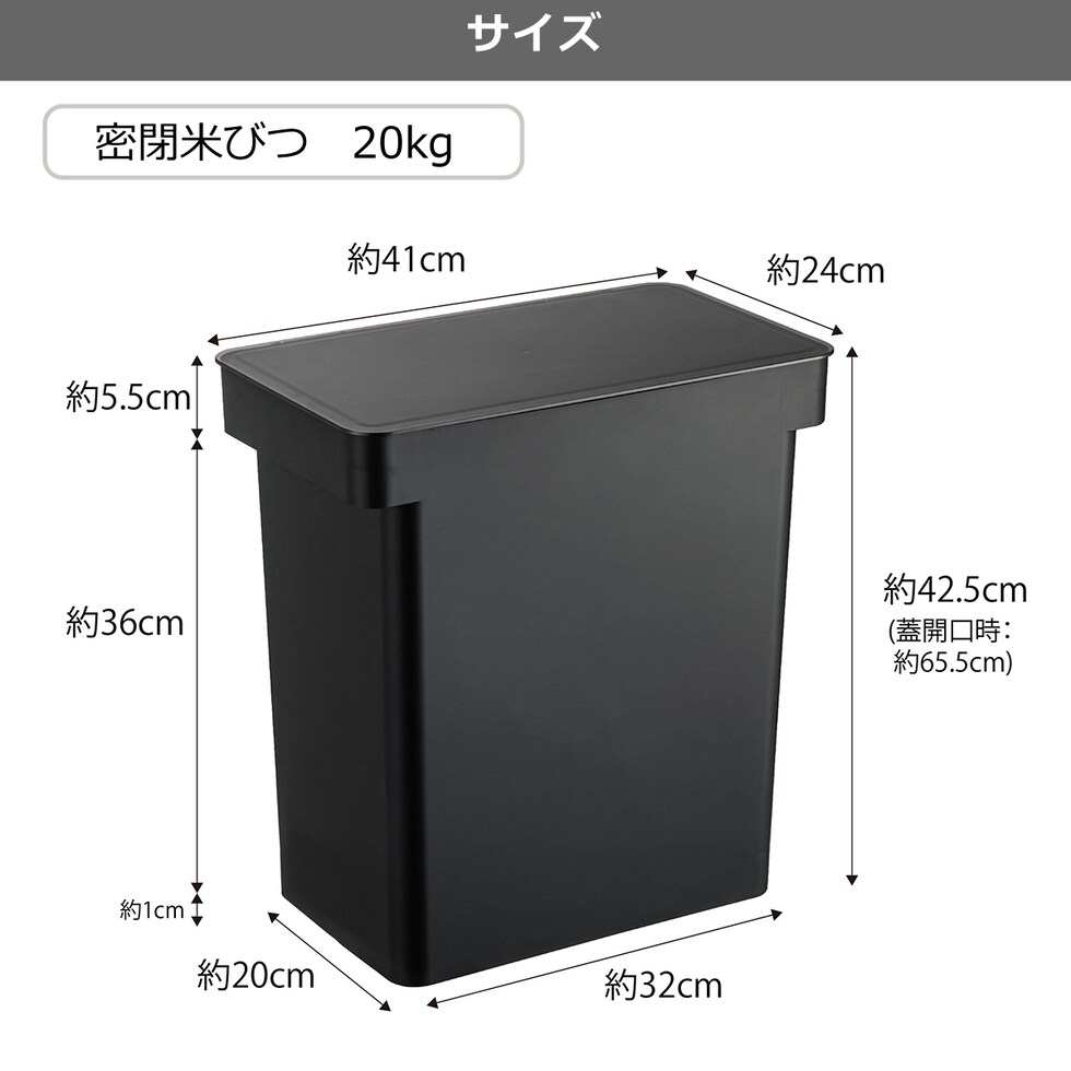 | 米びつ:約 W41 × D24 × H42.5(蓋開口時:H65.5) / 計量カップ:約 W7.8 × D7.3 × H7.4cm |