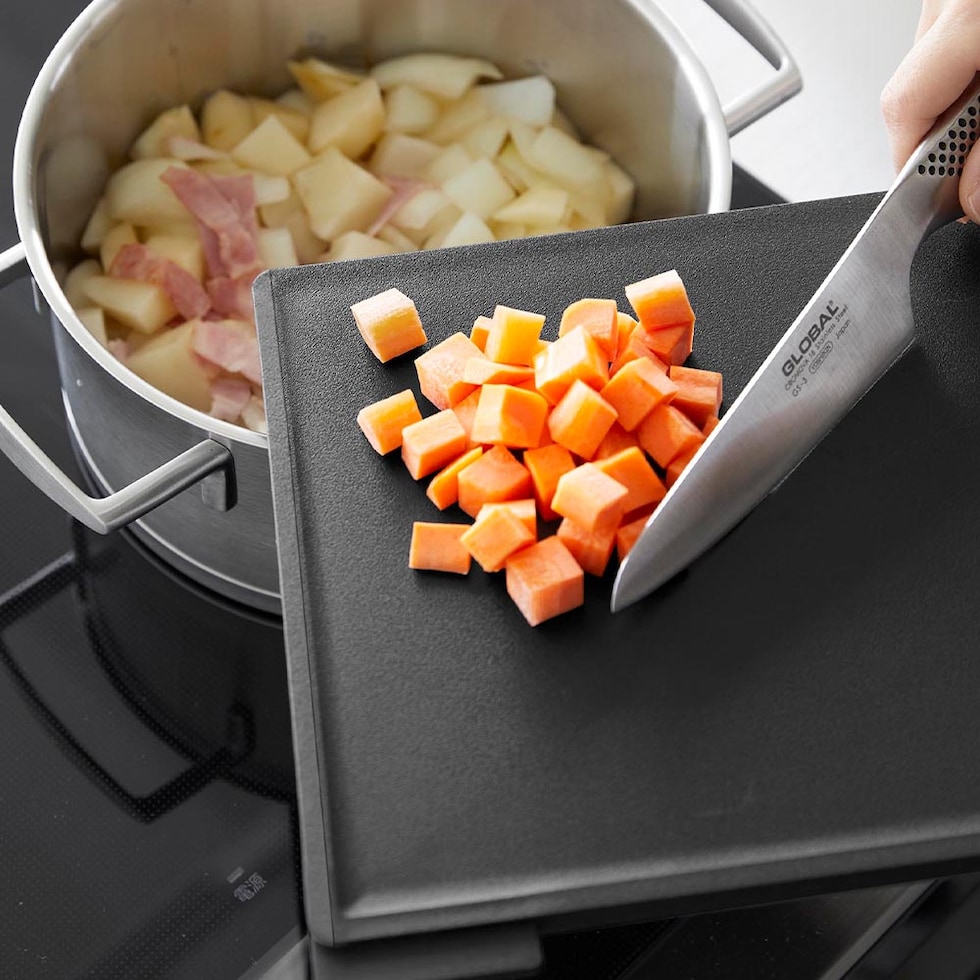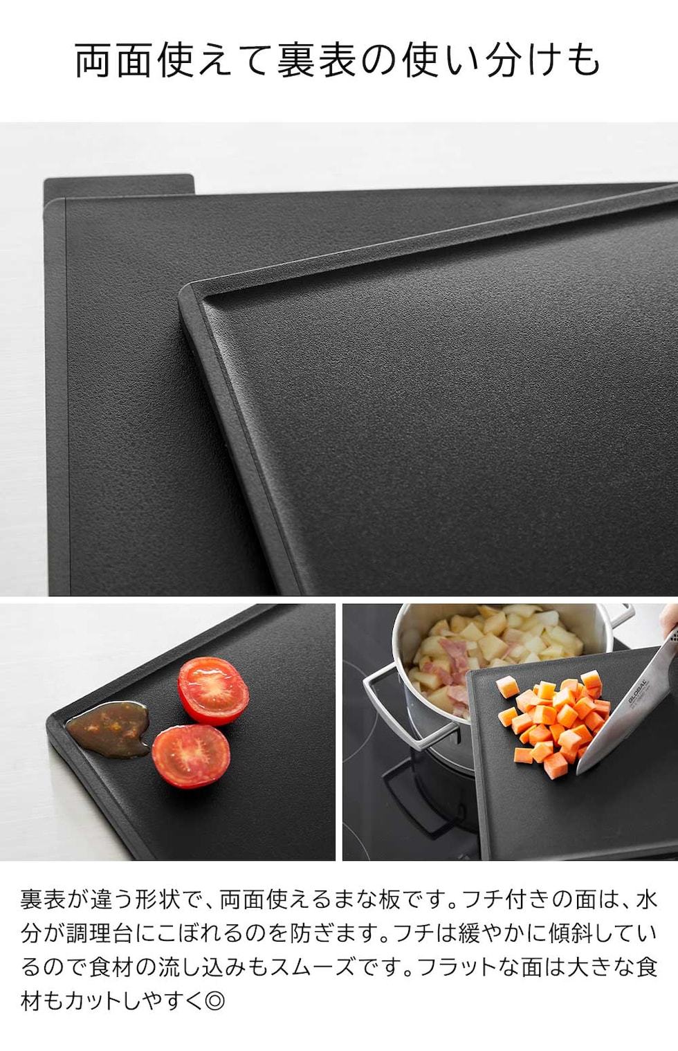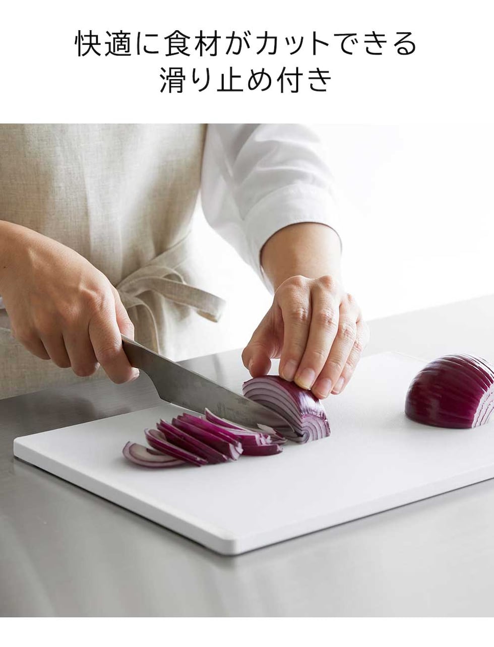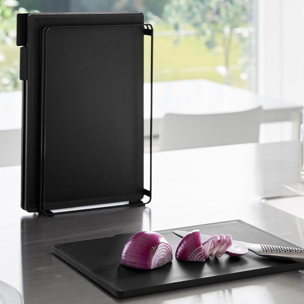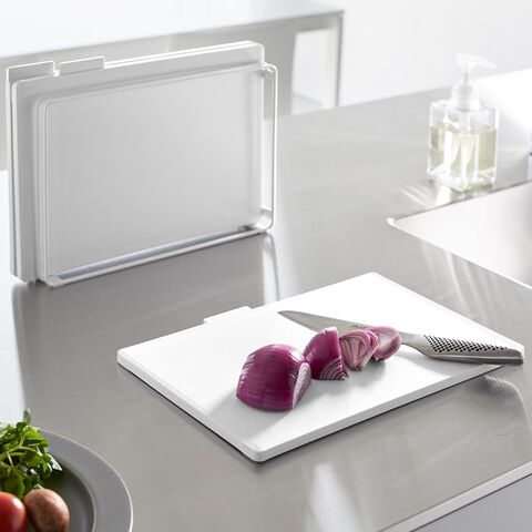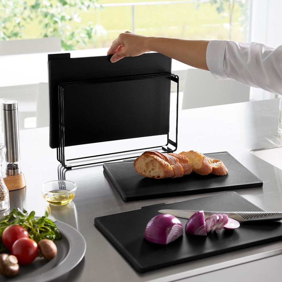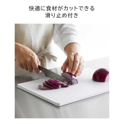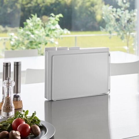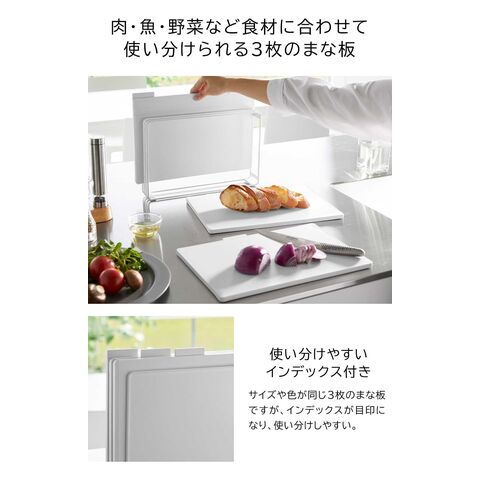 食材に合わせて使い分けできる、まな板3枚セットです。 1枚ずつにインデックスが付いたデザインで、肉・魚・野菜など使い分けの目印になります。 両面使えるまな板で、フラットな面とフチのある面があり裏表の使い分けも可能。 滑り止めが付いているので、まな板が動かず食材がスムーズにカットできます。 SIAAの基準を満たした抗菌加工済み。更に、食洗機対応だからお手入がラクラク。衛生的にお使いいただけます。 スタンドは、縦横どちらの向きにも置けるから、キッチンのスペースや使いやすさに合わせて設置ができます。