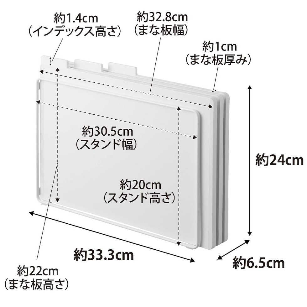 まな板:約W32.8×D22(インデックス含む:23.4)×H1cm(1枚あたり)